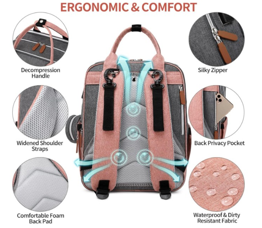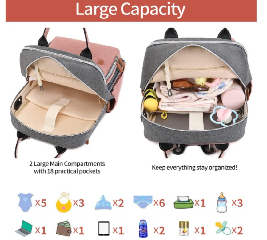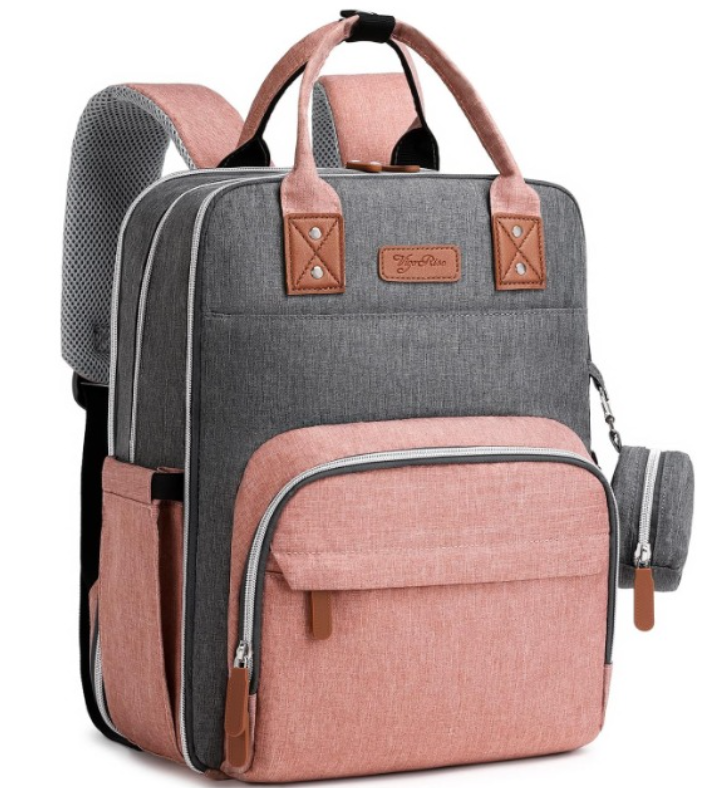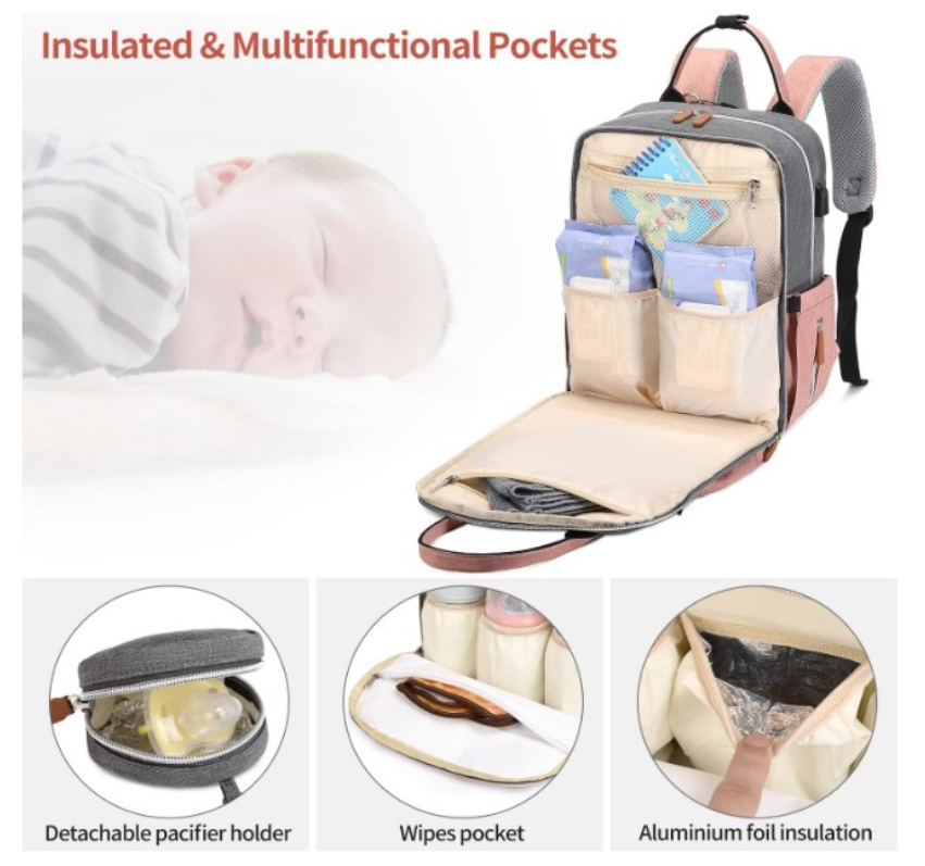Zelle[Multipurpose Modern Diaper Backpack] Designed to look stylish and functional. Includes built-in stroller clips, padded changing mat, plenty of pockets, a grab handle, and a detachable pacifier holder. It is a diaper bag that you will love enough to use as your daily regular bag with all the functional features, making your job as parents so much easier. [Stay Organized On-the-go] This baby diaper bag backpack (size: 15.7 x 11.4 x 7.8 inches) has 18 pockets! Features 3 insulated multipurpose pockets, a zip-down diaper organizer, several mesh pocket organizers, 2 front deep pockets, a key fob, and a padded laptop sleeve for tablets up to 15''. Keeping your diaper bag organized, while also storing a great deal of you and your baby’s necessities. [Convenient on the Go] Extra wide opening makes this diaper backpack easy to find essentials in a pinch, and dual zippers for easy-access & closure even with one hand! Easy-grab handle & back ergonomic design & thick padded shoulder straps offer you a comfortable carrying and of force reinforcement. [Built for Last] diaper backpack is made of lightweight, durable and waterproof fabric (Stronger than twill polyester mom bag, better in deform resistance & tear resistance). Non-fraying stitching, and strong zippers. Reinforced seams in shoulder straps and handle, without ripping. [Great Gift Ideal] Features gender neutral color scheme and modern style, this diaper bag is right for both men and women. It sits super comfortably on your back, also will be an amazing baby registry shower gift & functional weekender Bag & laptop backpack.