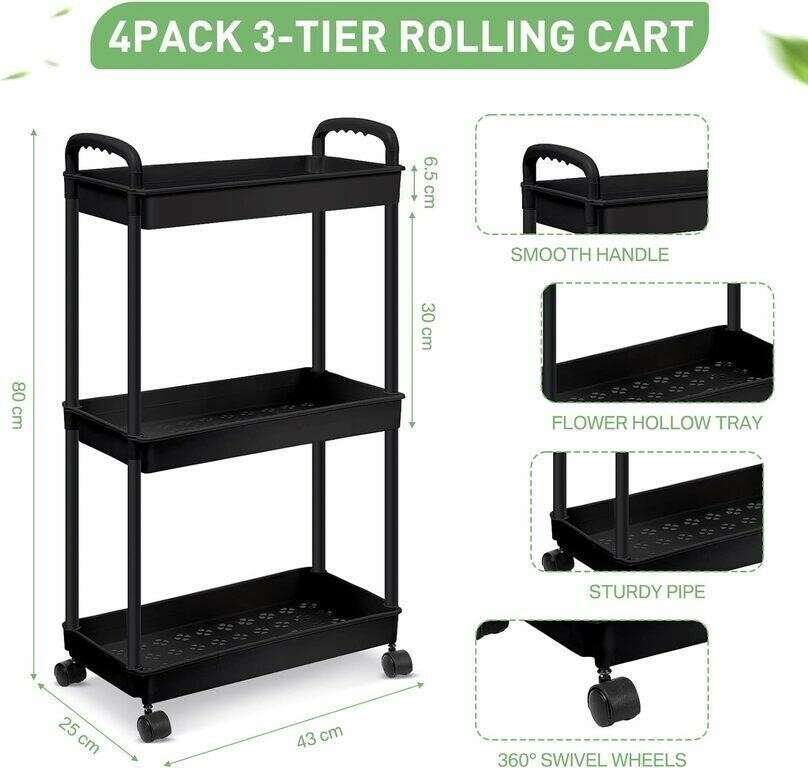 Storage cart that can be used for several different purposess. You can use them in different rooms according to your needs. No need to worry about not having enough space to store things. Quality Material: Ultrathin storage cart is made of quality plastic and load bearing parts .Made of quality stainless steel pipe which is stable and not easy to deform and rust free. Very reliable: The Tray has a hollow design, which is convenient for keep things from falling during transport. Mobile Flexibility: The trolley wheels easily moved 360 degrees. There swivel design make the storage cart easy to move around the room and the 2 back wheels are 2 lockable to prevent the cart from moving or tipping over when stopped Practical Design: 3 tier drawer rolling cart comes with extra capacity, increased layer spacing, to 11.81 inches/ 30 cm more convenient to take and place items. 2.56 inches/ 6.5 cm high guardrail prevents items from falling. Easy to store: food, ingredients, snacks, spices, drinks, and fruits. Easy to Assemble: just follow the simple instructions to assemble your cart. Product can be easily assembled within 10 minutes, without additional tools Condition: New Factory Sealed Assembly Required: Yes Brand: Leinuosen UPC: B0C3M4WGJ6 Model: Leinuosen-Cart-JDUO34 Lot 99 1-2-24 1750