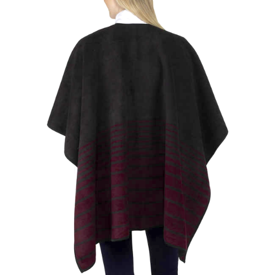 ApplePaySuper Soft Reversible (Black and Maroon) Poncho Style Fashion Wrap - One Size. It can be worn multiple ways. 100% Polyester. Reverses from print to high pile fleece. So pretty and cozy!! Only worn once.
