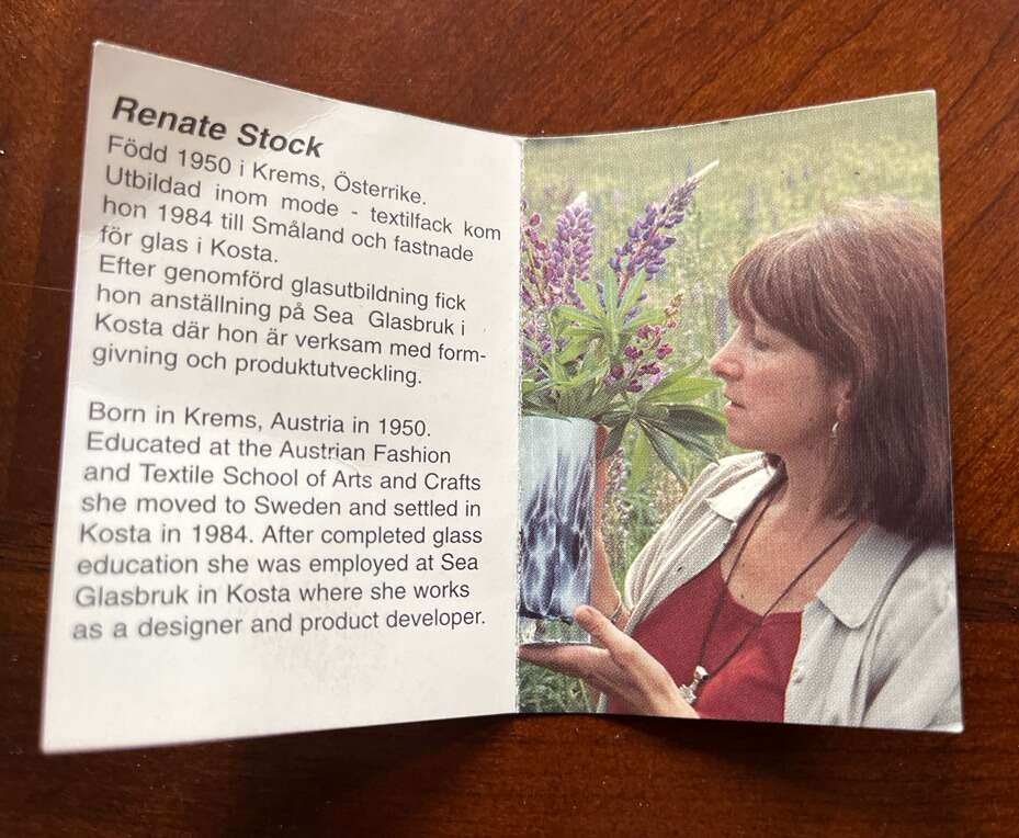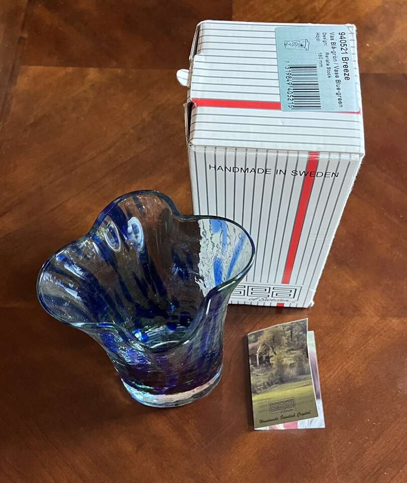 6,3” tall x 3,5”- 4,3” wide Breeze blue-green Vase. Handmade in Sweden by Sea of Sweden. Design of Renate Stock. Comes with the original box and a description. $10