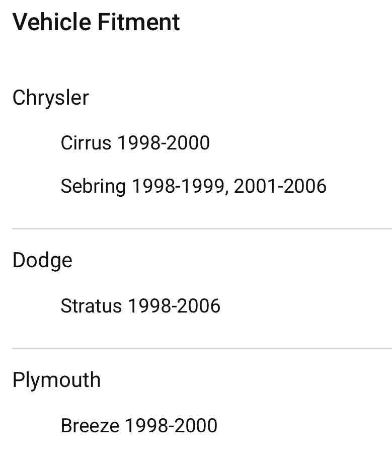 Description- FRONT DRIVER’S SIDE premium CV axle shaft for various 1988-2006 Chrysler Cirrus/Sebring, Dodge Stratus and Plymouth Breeze models, (see photos for complete fitment chart). See photos for more product information and specifications.