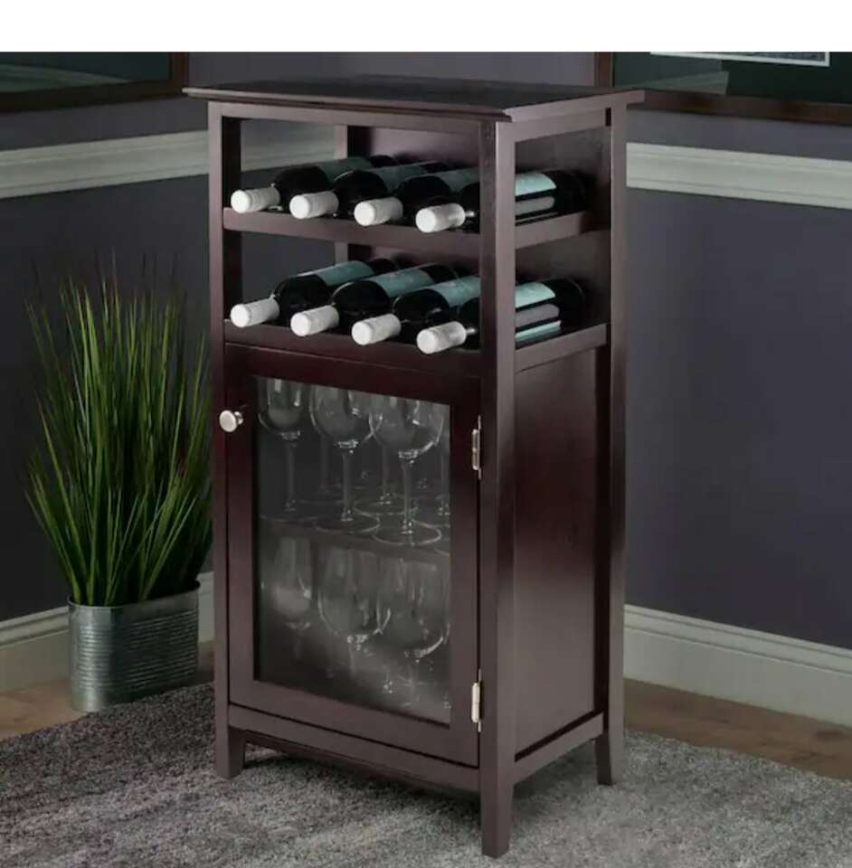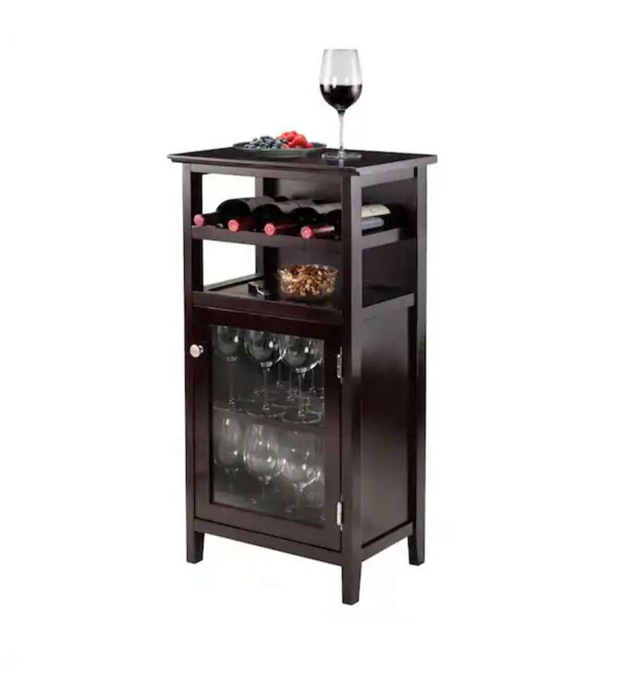The Alta wine storage shelf brings a contemporary solution to your wine storage and entertaining needs with its clean lines, espresso finish, and simplistic design. The 2 top shelves can be used for either 8 wine bottles or 4 wine bottles on the top shelf and accessory storage on the bottom. Behind the glass cabinet door is a 15.2 in. W x 10.5 in. D x 19.7 in. H storage space with a middle shelf where wine glasses can be stored. The overall size of this storage is 19.1 in. W x 12.7 in. D x 37.4 in. H. Wine rack dimensions are 15.2 in. W x 11.5 in. D x 4.8 in. H.