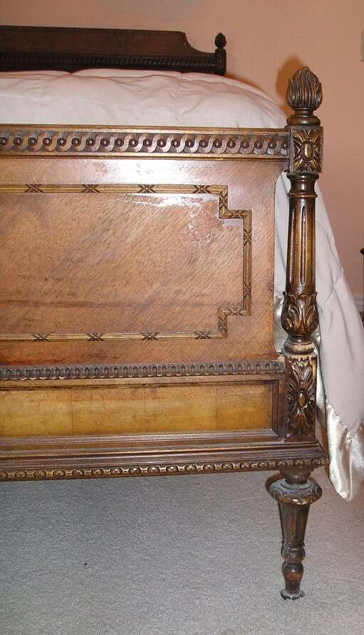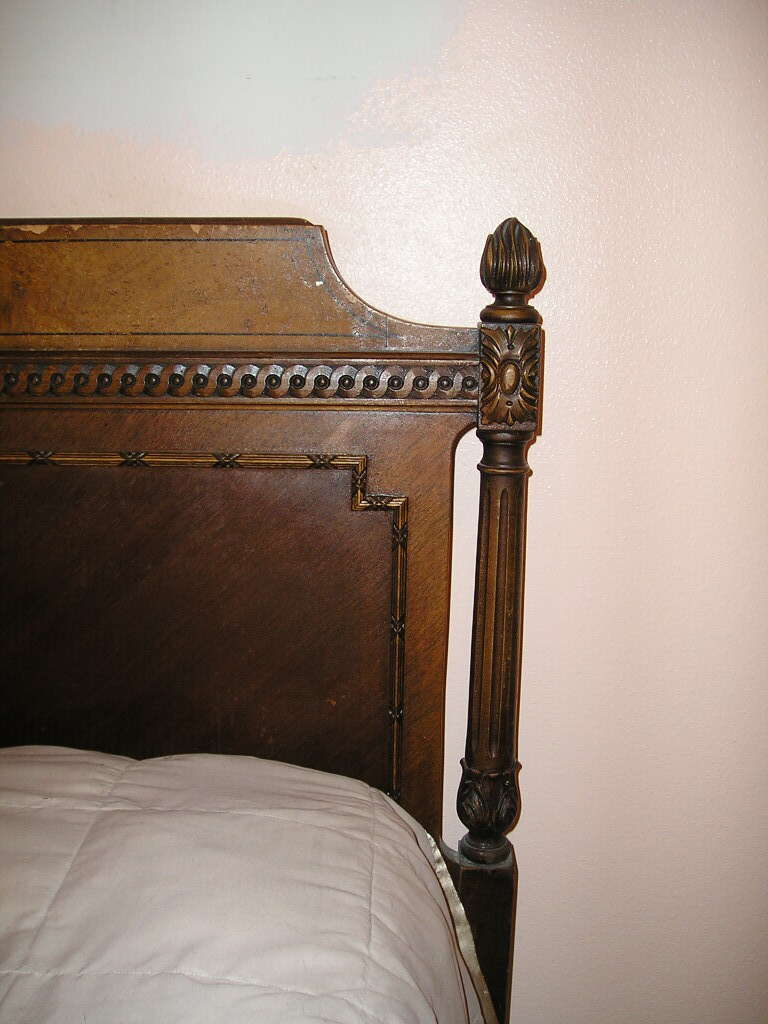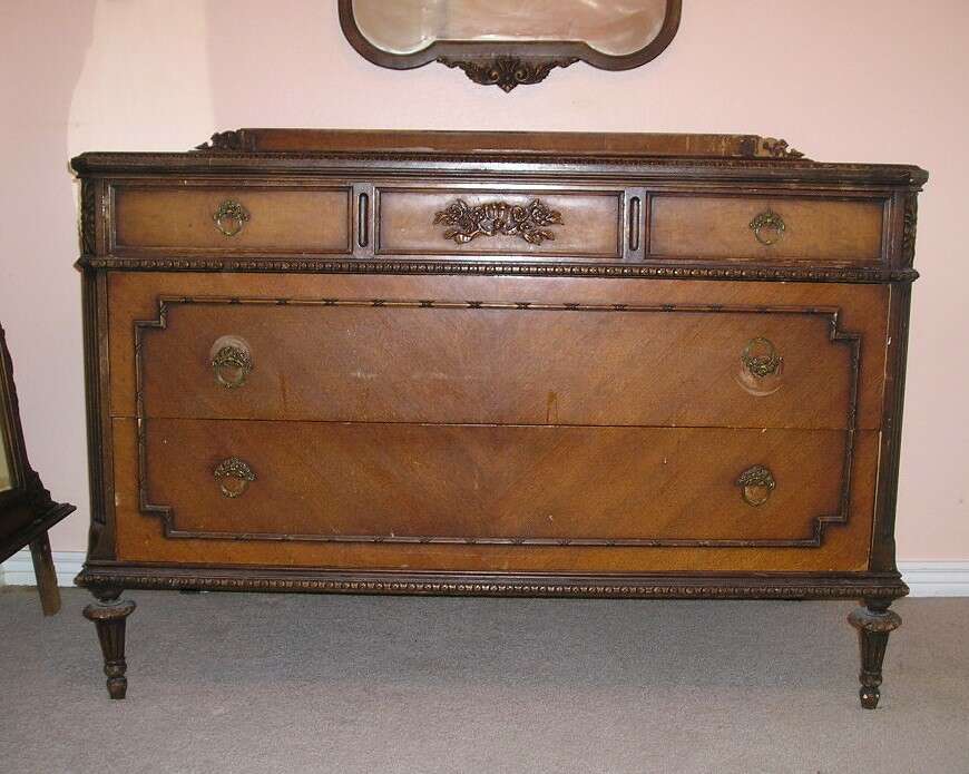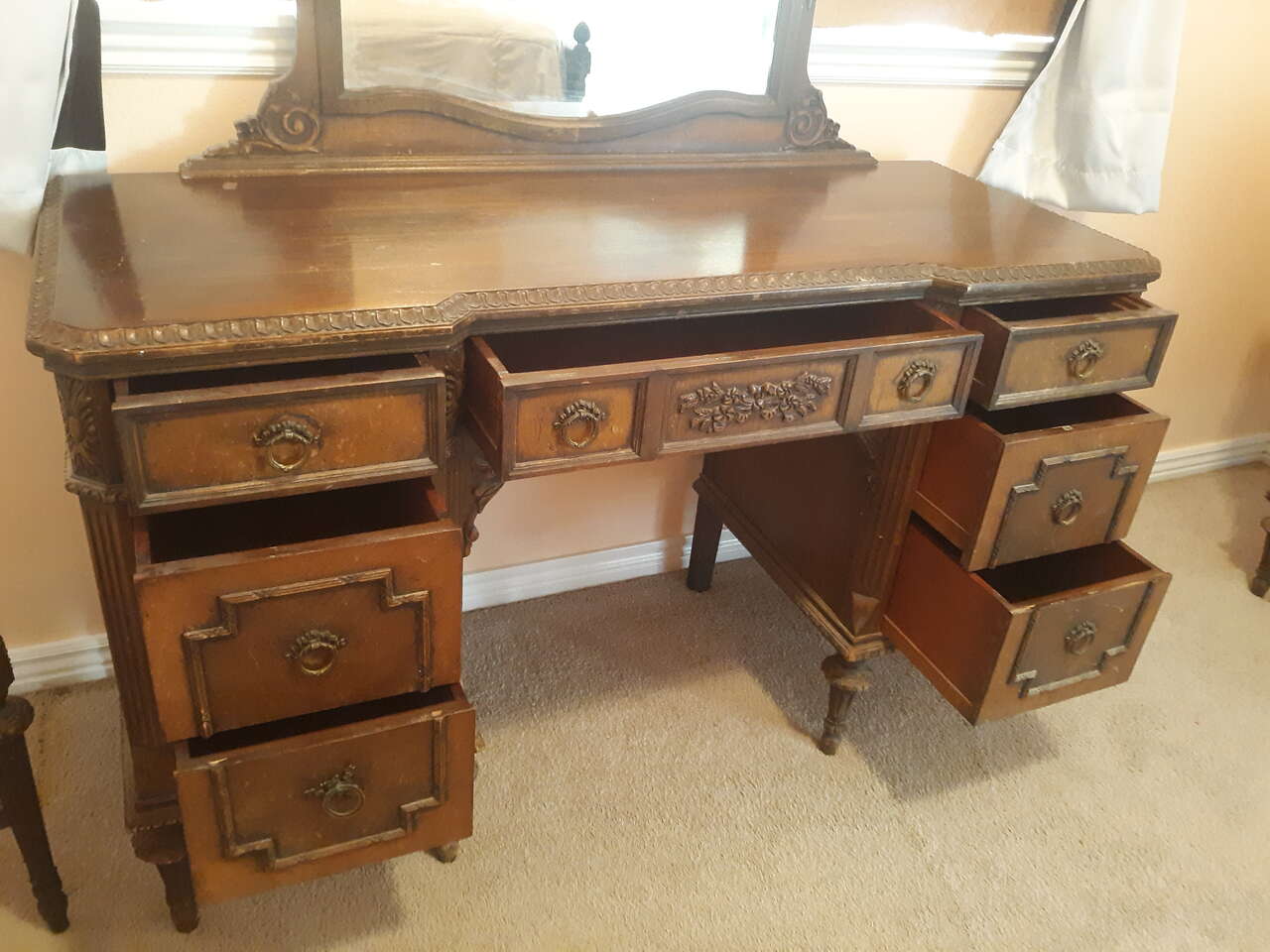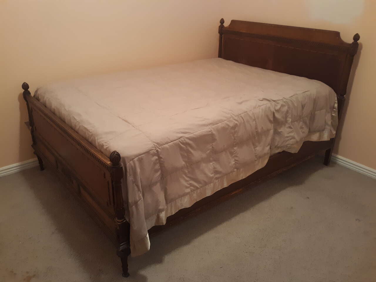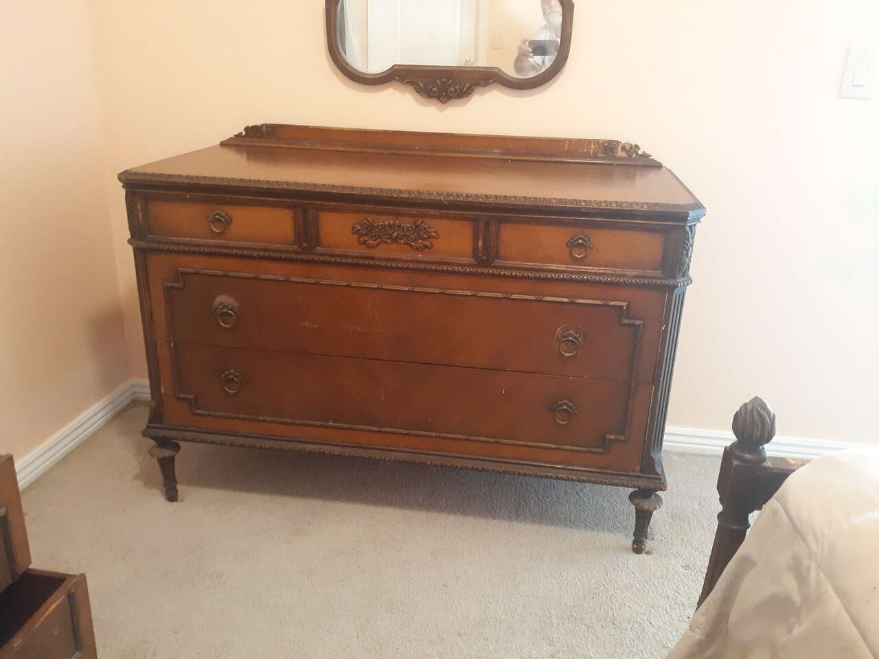 5 pcs Cherry wood bedroom set. Chest of drawers, dresser w/ mirror and bench, hanging mirror, and bed frame. keep or leave mattress (full size 54" x 75") Was made by The Northern Furniture Co (Sheboygan,Wisconsin) in the 50's. all cherry wood, with inlay.