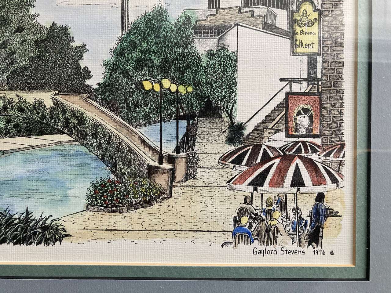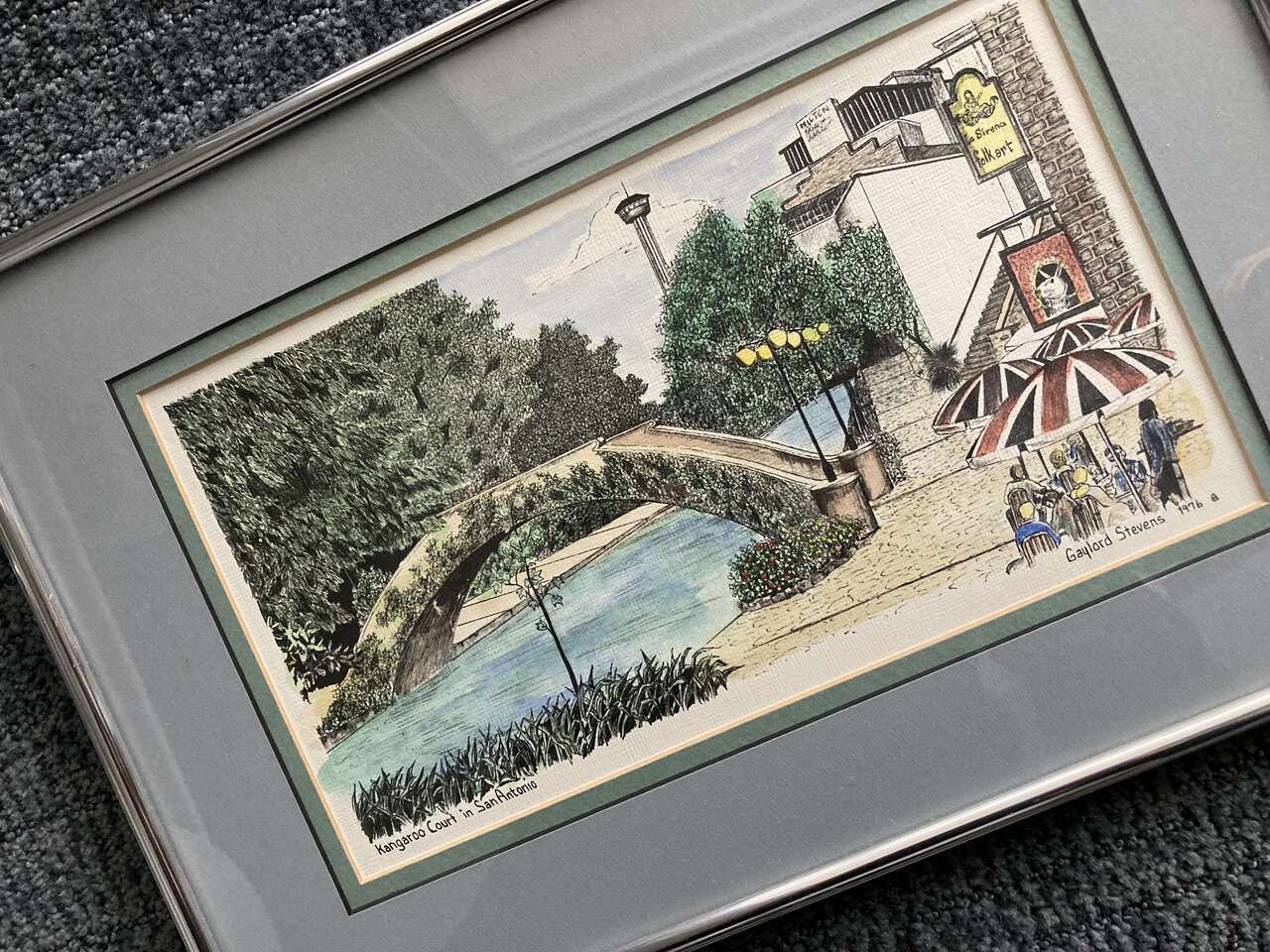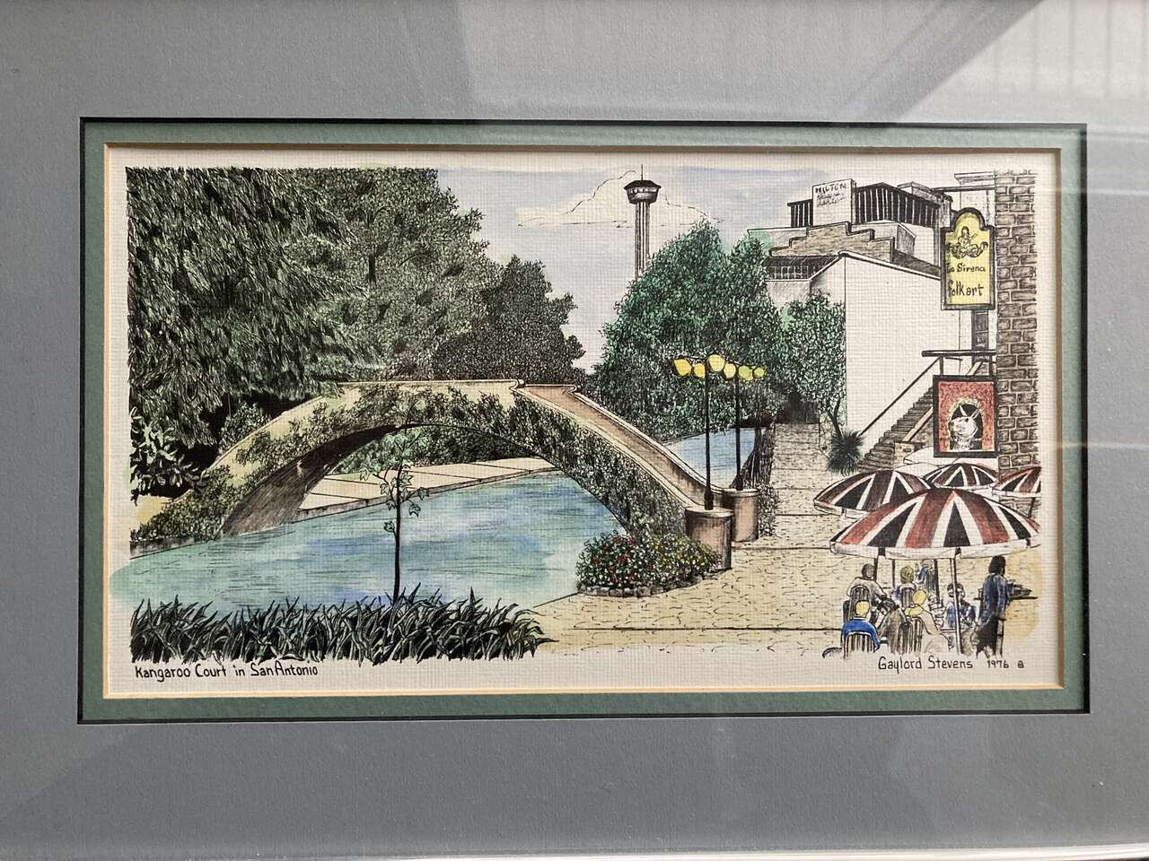 VenmoVintage 1976 Kangaroo Court, San Antonio, Texas. This watercolor is of the river walk, it is by Gaylord Stevens. I had it custom framed at Style Craft in SLC. The whole picture measures 15" x 10.25, the art measures 10.75" x 6.5". Please see more by seller for other San Antonio collectibles from our home and family home. (Lowered price from $50)