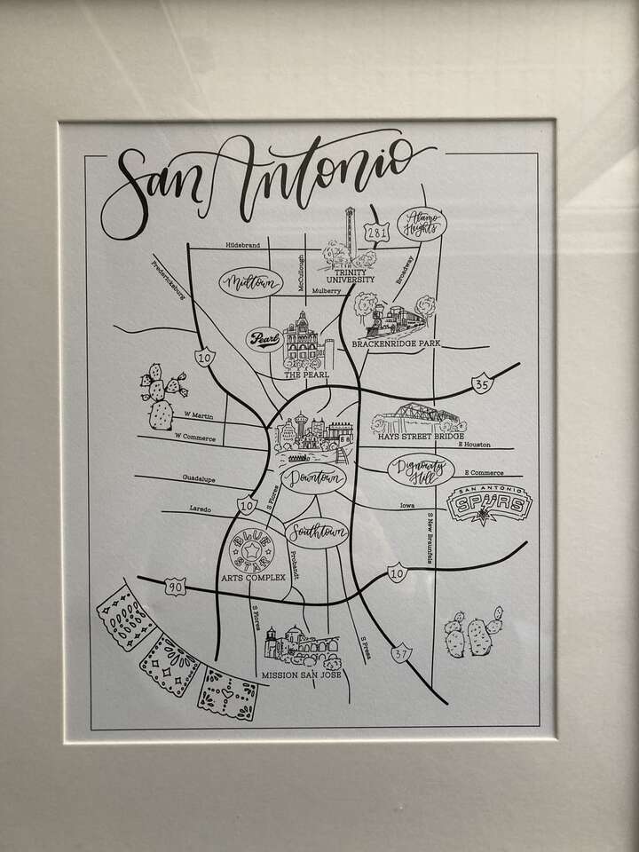 VenmoFramed San Antonio illustrated map art, depicting some favorite places with names and designs. measures 12.5 x 15.5, inside measurement 7.5" x 9.5". Please see more by seller for more San Antonio items from our home and family home, and many collectibles.