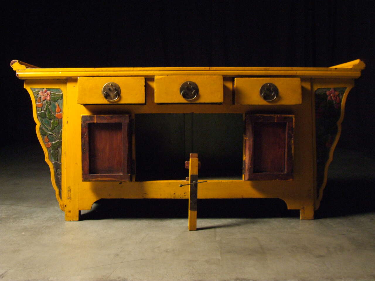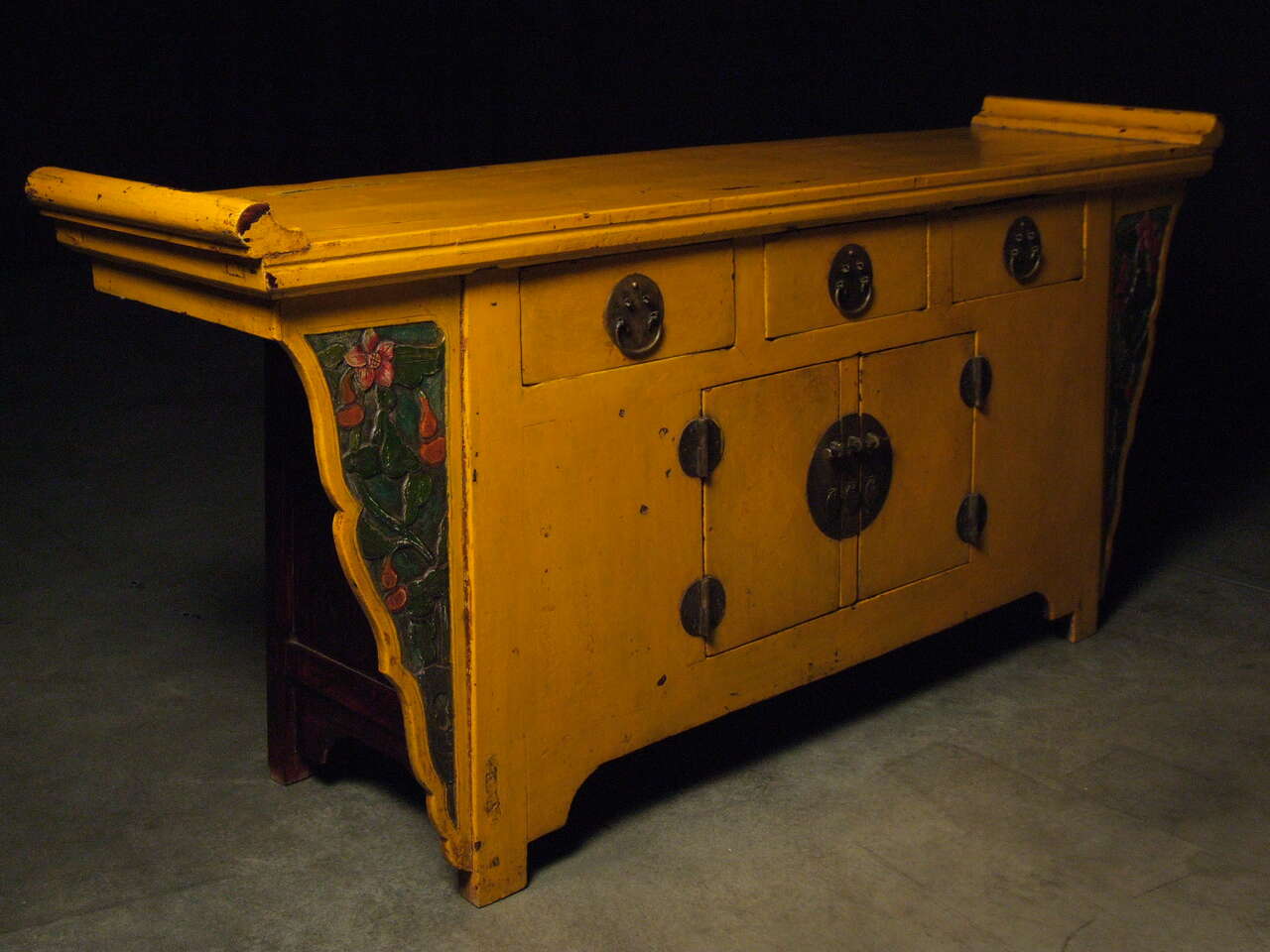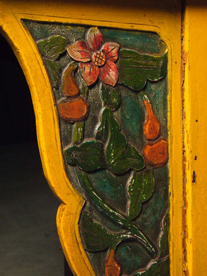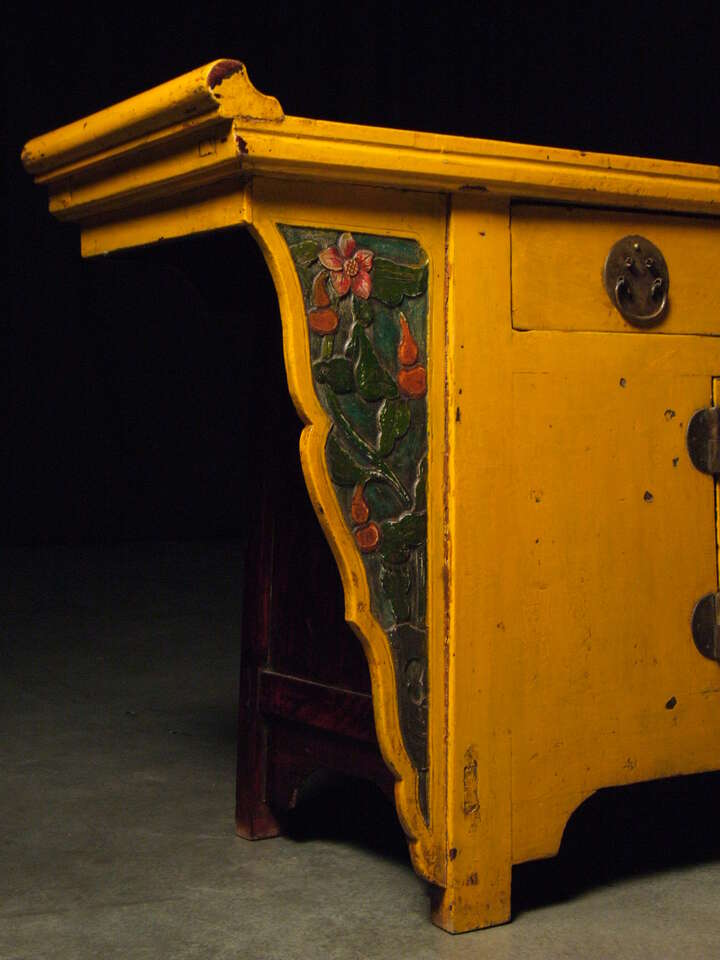 Creating a visual impression can be difficult, but for you it will be easy with this antique Chinese sideboard. Its bright ocean palette will add a coastal vibrance to your space. Original metalwork and custom carvings will make this piece the star of your collection. The piece’s pleasant shape and intelligent construction can create a charming atmosphere and a functional space. The winged structure and brilliant colors of this piece radiate life throughout a room, providing a positive visual accent to your home. Bring home your Chinese yellow sideboard today and enjoy its oceanic positivity for years to come!
