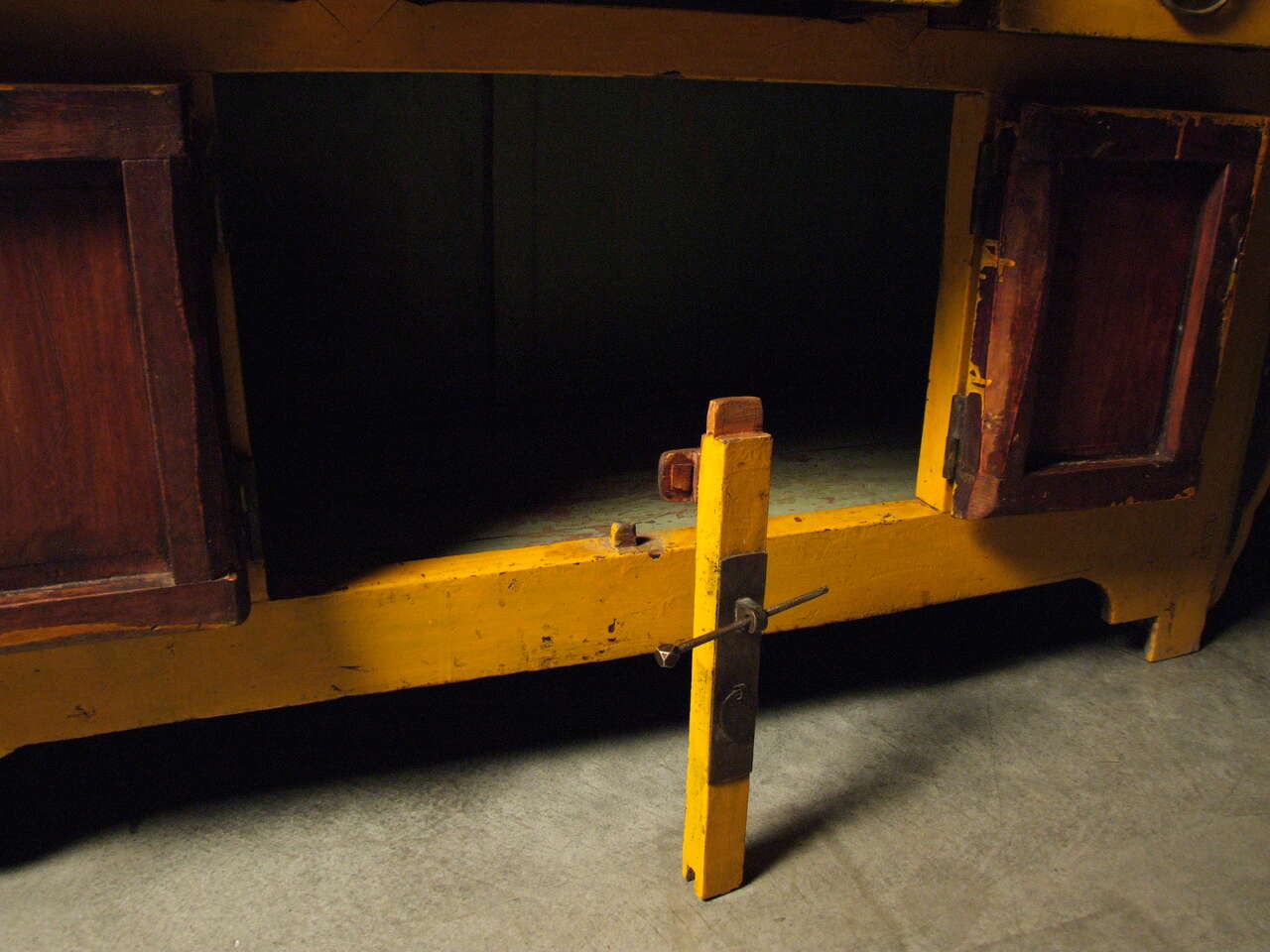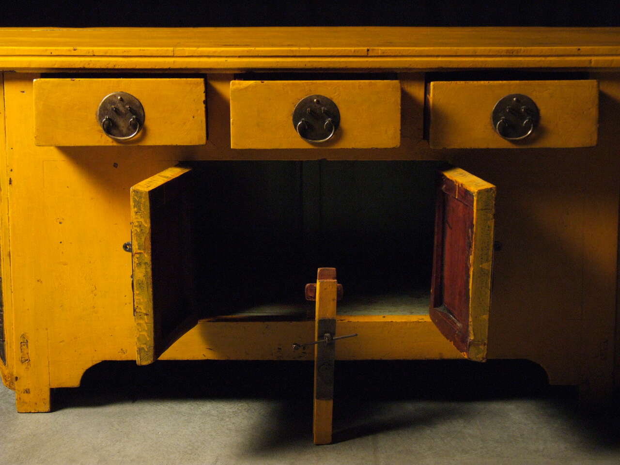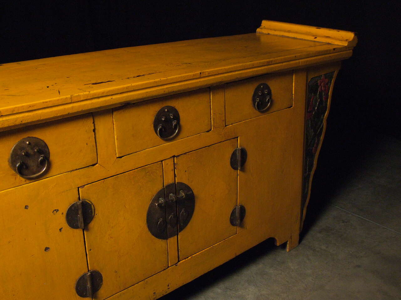 Creating a visual impression can be difficult, but for you it will be easy with this antique Chinese sideboard. Its bright ocean palette will add a coastal vibrance to your space. Original metalwork and custom carvings will make this piece the star of your collection. The piece’s pleasant shape and intelligent construction can create a charming atmosphere and a functional space. The winged structure and brilliant colors of this piece radiate life throughout a room, providing a positive visual accent to your home. Bring home your Chinese yellow sideboard today and enjoy its oceanic positivity for years to come!