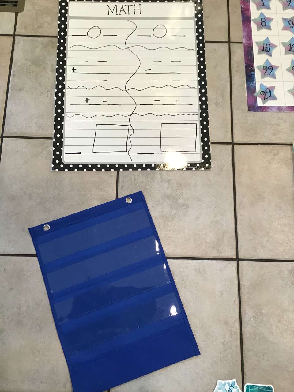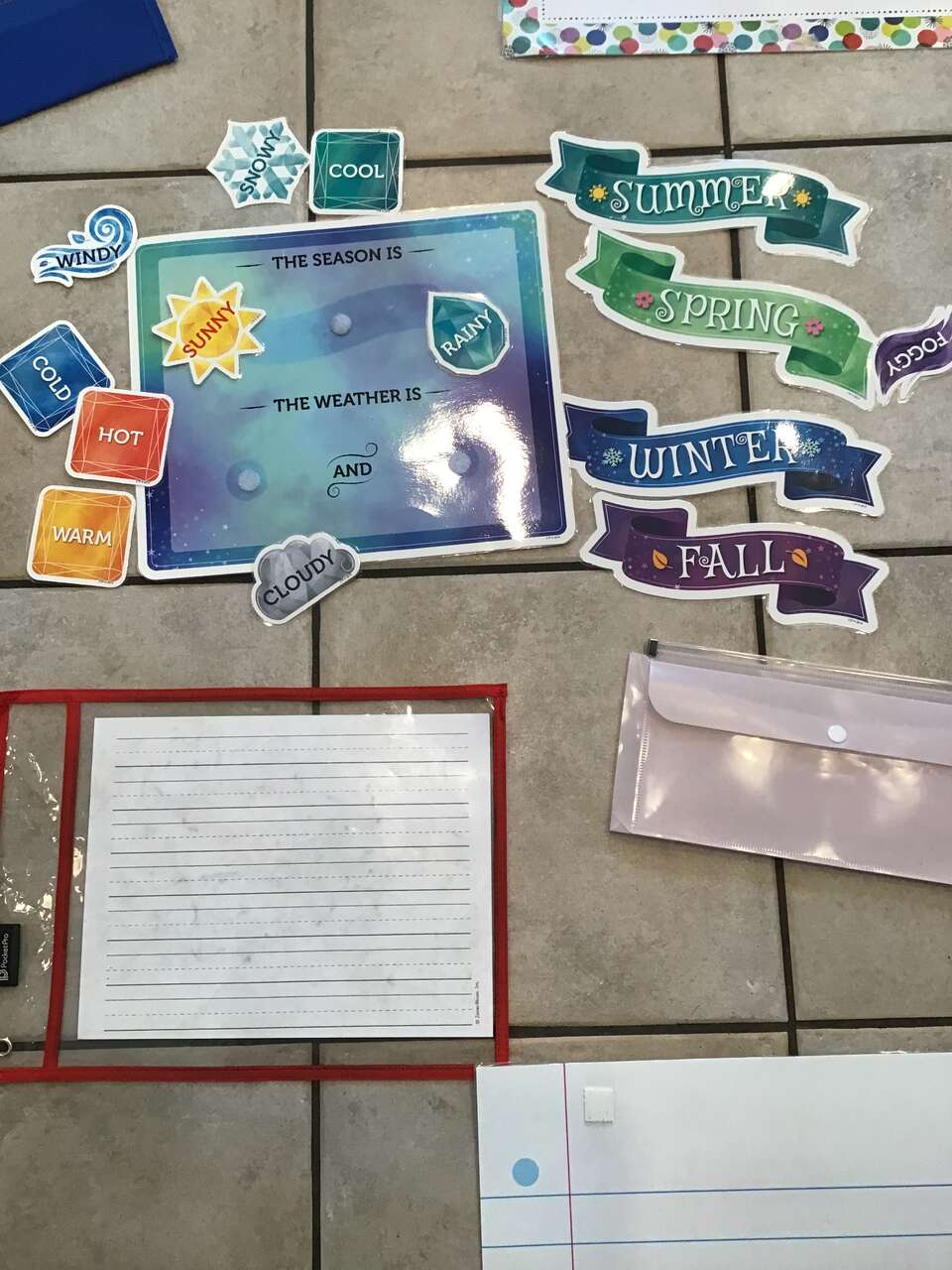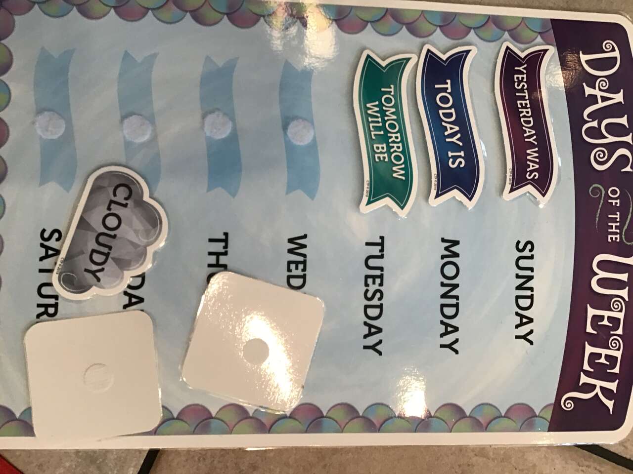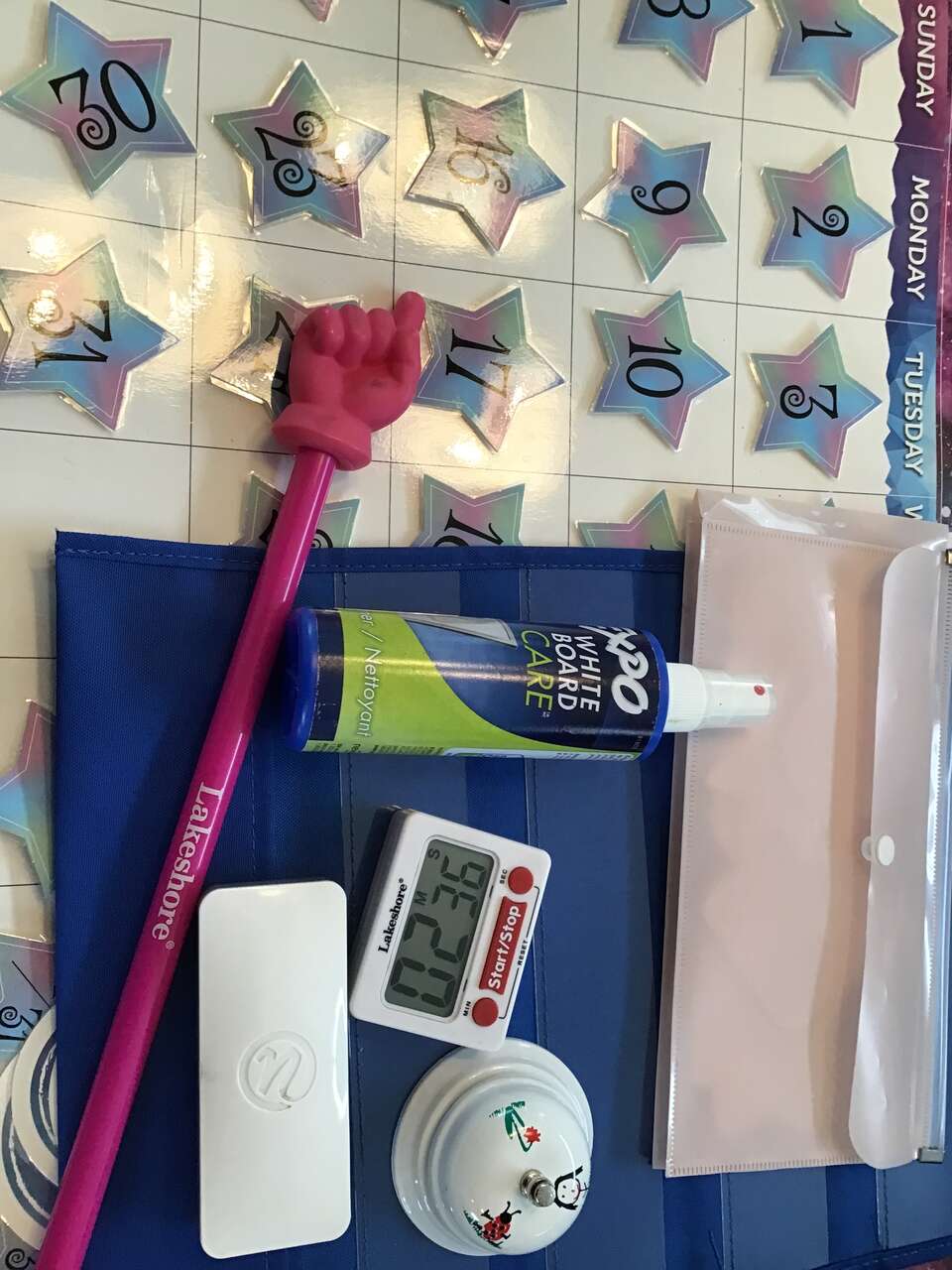 All Pieces are laminated and have Velcro to stick . White board and large laminated posters are 20" X 19". Bell, timer,pointer, eraser included. Fun set for playing school :)