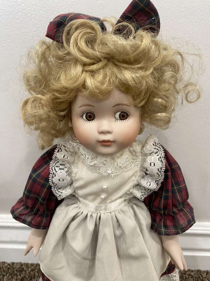 Blonde curly hair w/brown eyes. I do not have the brand name