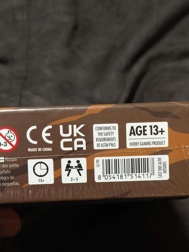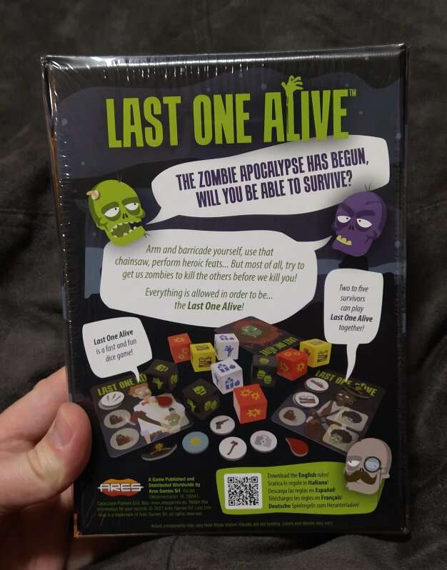 Last One Alive (new in shrinkwrap) is a 2-5 player game that takes about 15 minutes to play. "Arm and barricade yourself, use that chainsaw, perform heroic feats... But most of all, try to get us zombies to kill the others before we kill you! Everything is allowed in order to be... the Last One Alive!"