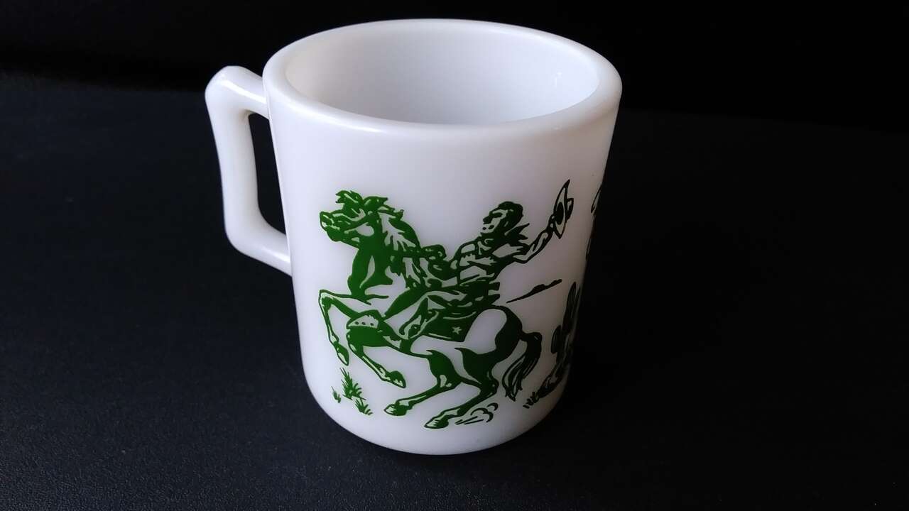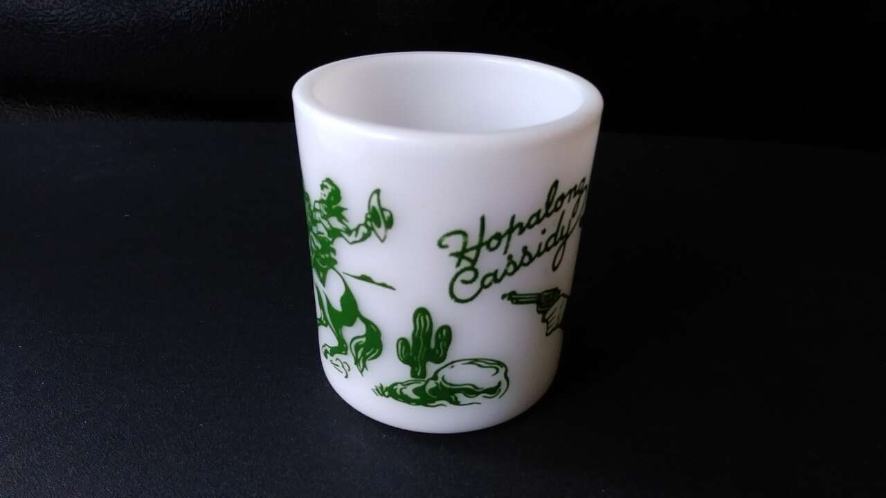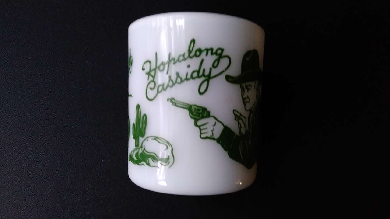 VenmoThis is a great old Western mug Hopalong Cassidy heavy milk glass mug with wielding guns, from about 1950's' I was told its made by Hazel Atlas. “Hopalong Cassidy” in rope style letters and a cowboy on horse. The green decorating is all around the mug. Please see all photos.