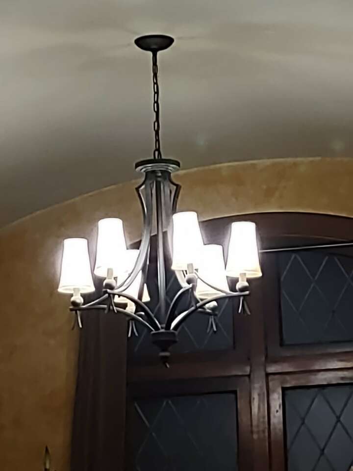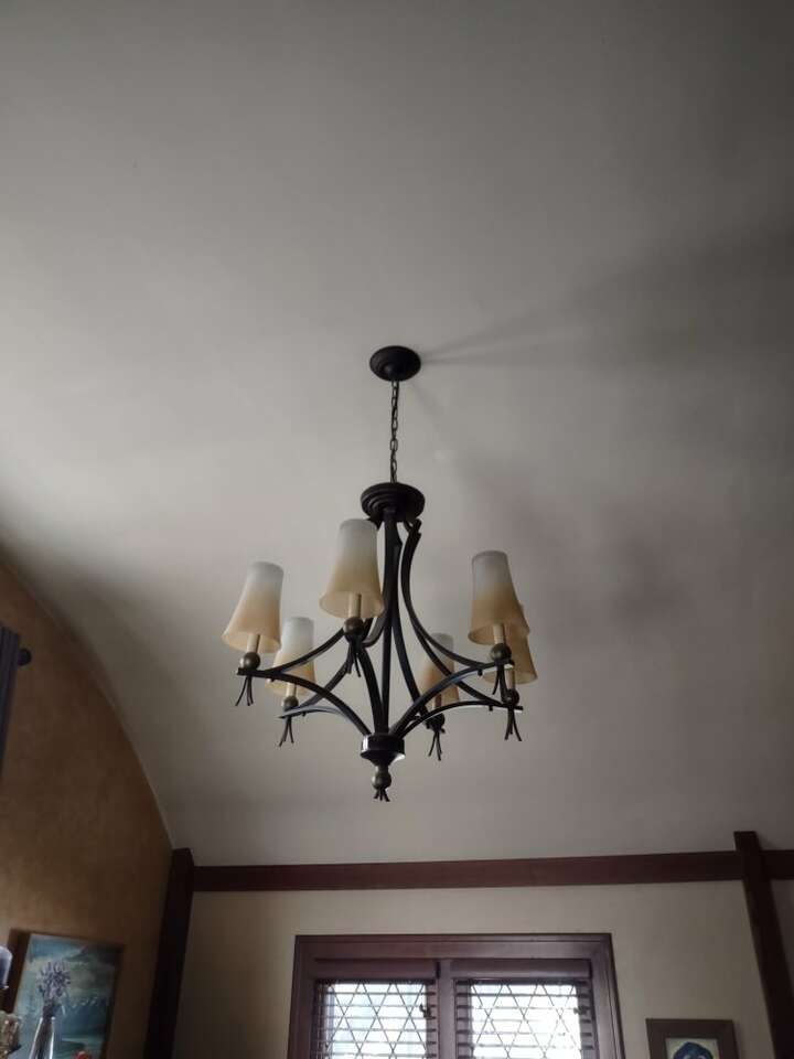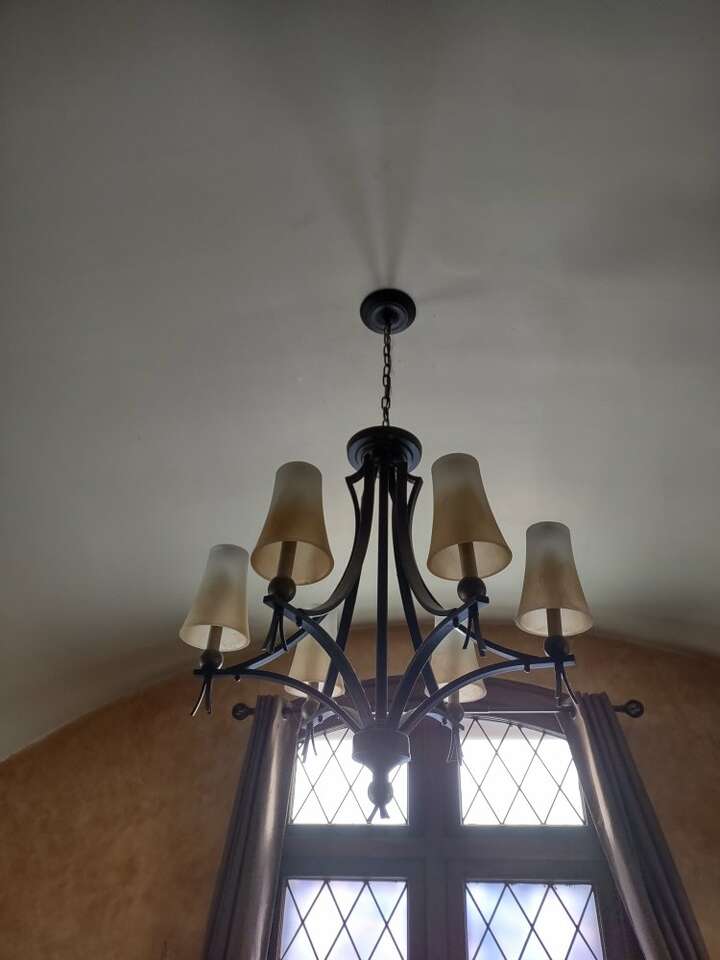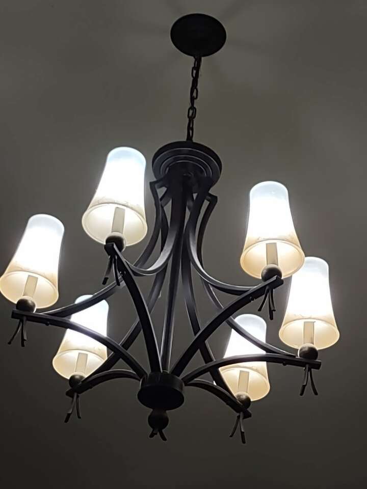 Used 6 light iron chandelier Dark Bronze/Iron 29" tall plus 16" chain. 27" wide. It needs a minimum 10 foot high ceiling.