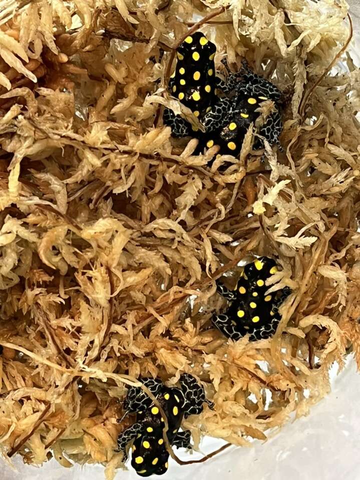 Brazilian Poison Dart Frog, Ranitomeya vanzolinii. These gems of the rainforest are primarily black with yellow spotting and bluish white reticulated legs. Ranging from Amazonian forests of Peru and Brazil. Active during the day with males occasionally making a trilling call. Because of the size of these poison dart frogs, they’re referred to as “thumbnails”. Females often reach 18mm with males being smaller. They can be kept in groups.