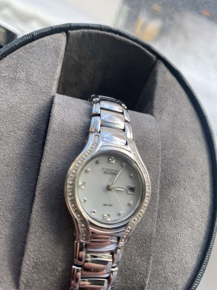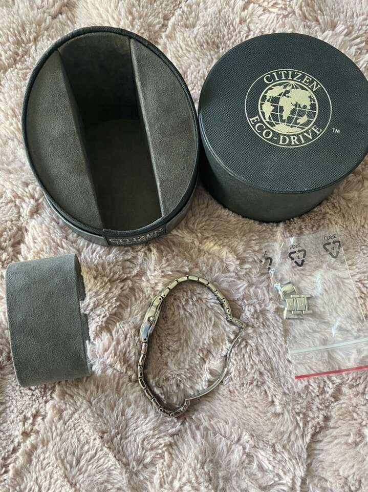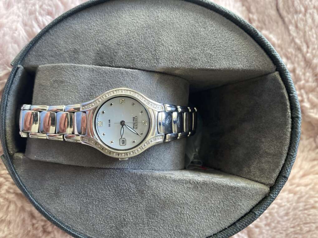 This watch is practically new! I bought it for the wife and she doesn’t like it ? I paid 550$ plus tax about 4 years ago. It’s Eco drive and never needs a new battery. It has 3 nice real diamonds on the face! Everything works. It comes with extra parts for the band to fit any size wrist. (Women). I’m asking 300$ obo. Also comes with all original packaging to make it perfect to present as a gift.