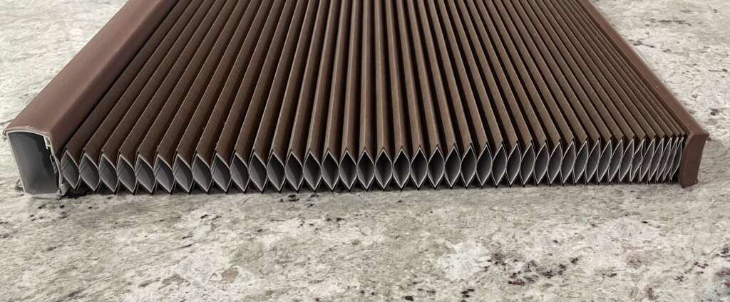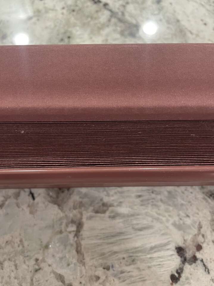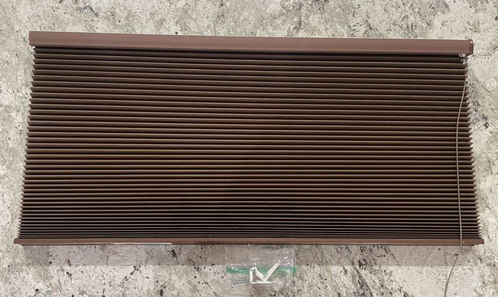 2 large brown colored. 1” pleat. Cordless. 66.25” wide x 2.75” deep x 59” long $40/each