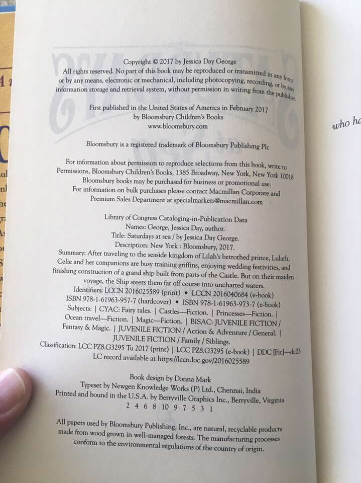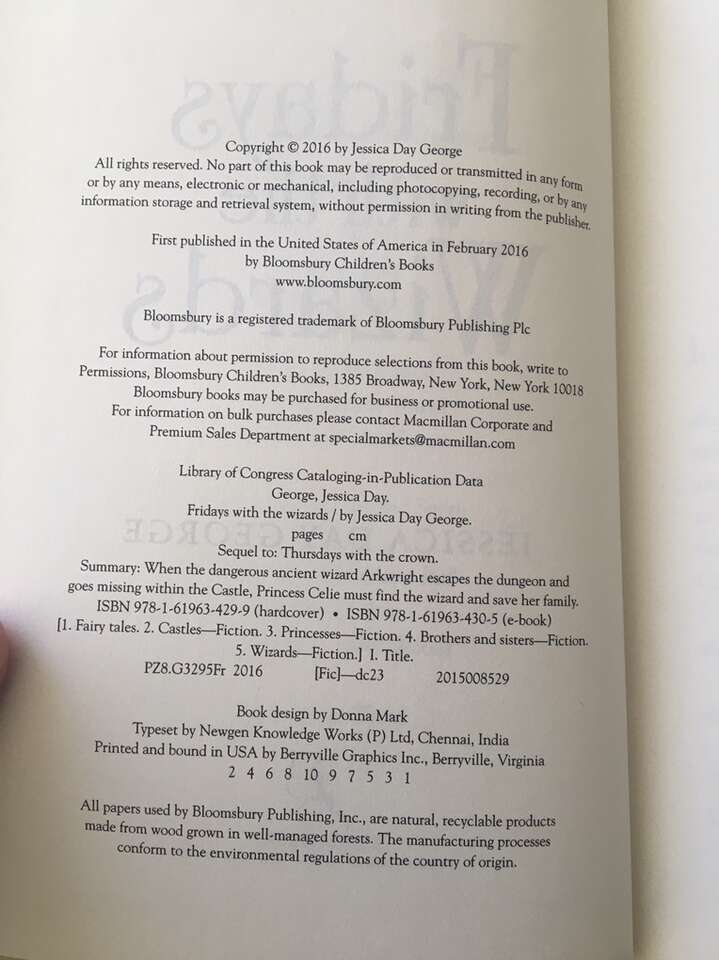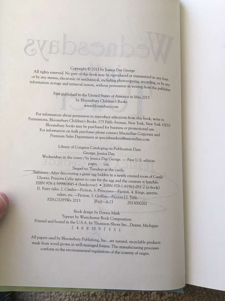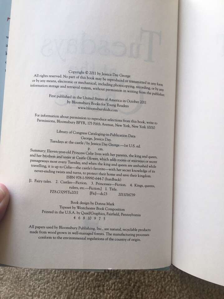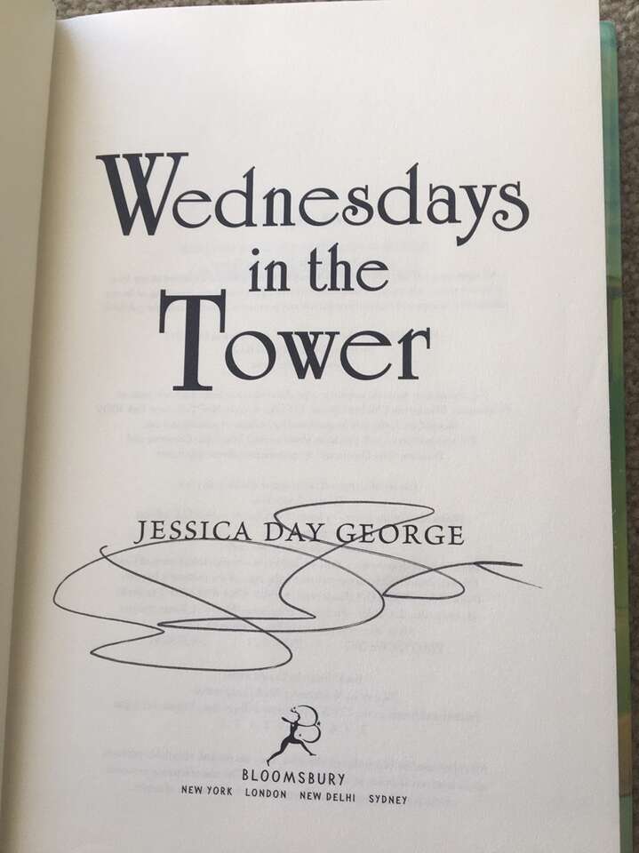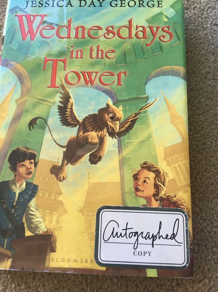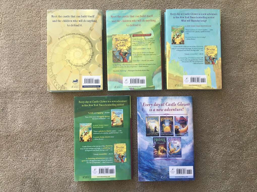 Tuesdays at the Castle Complete Series, by Jessica Day George: Tuesdays at the Castle (2011, 228 pages), Wednesdays in the Tower—SIGNED (2013, 229 pages), Thursdays with the Crown (2014, 212 pages), Fridays with the Wizards (2016, 234 pages—stamp from previous owner on title page), and Saturdays at Sea (2017, 262 pages). First edition hardbacks in very good condition, including dust jackets. Published by Bloomsbury. Text only. Cash or Venmo.