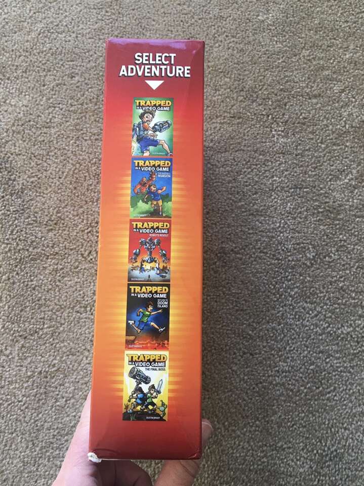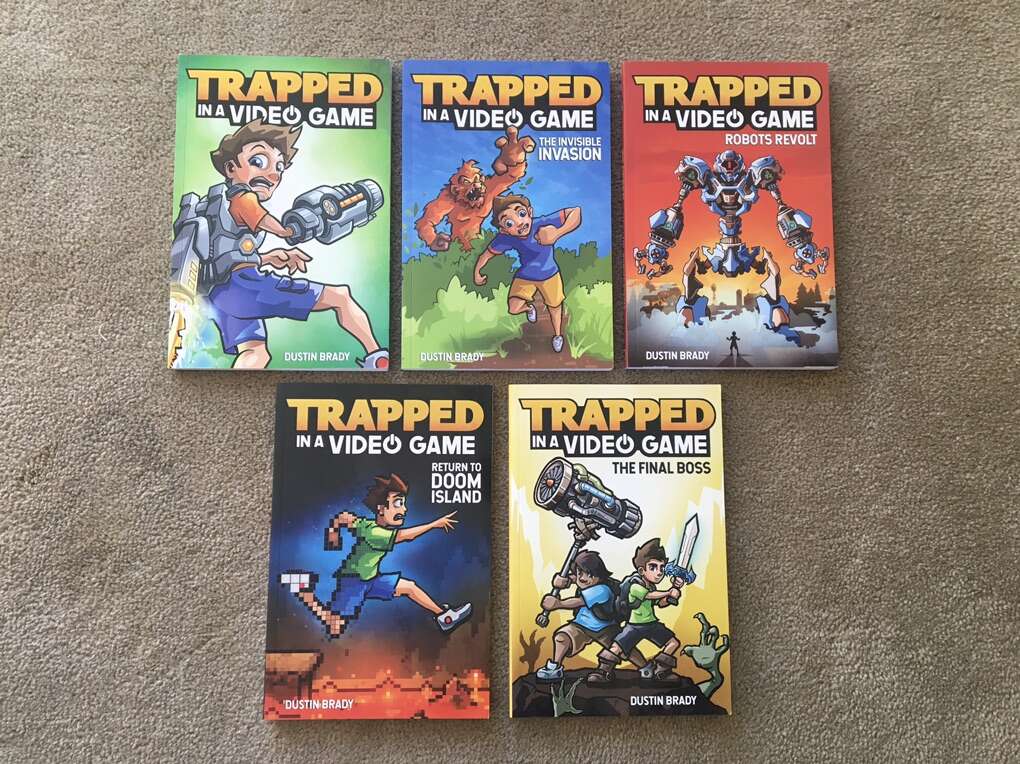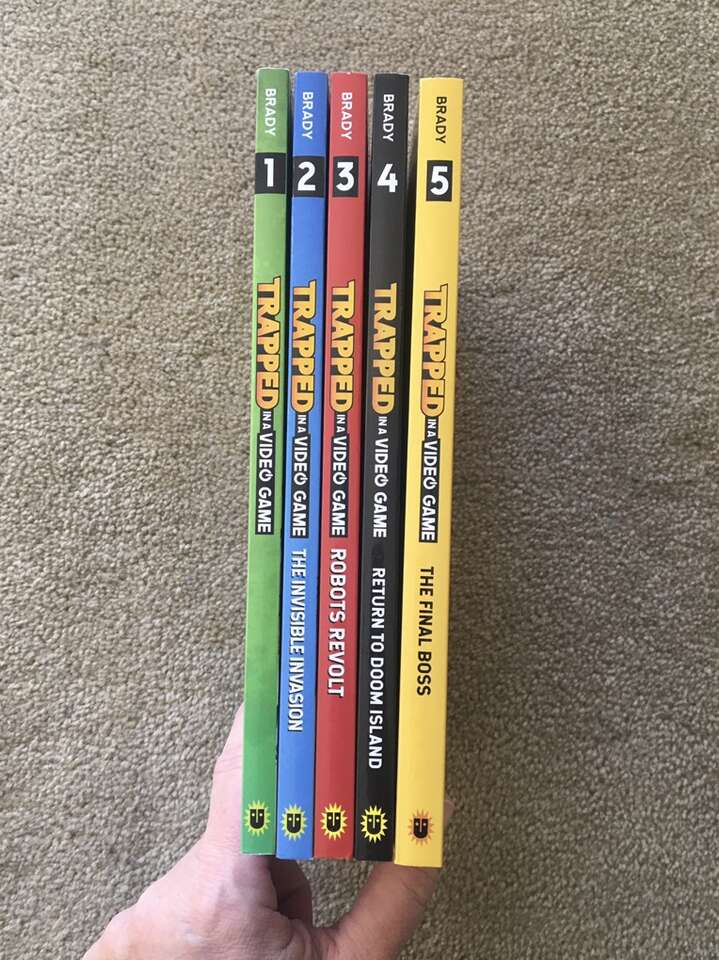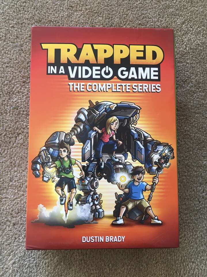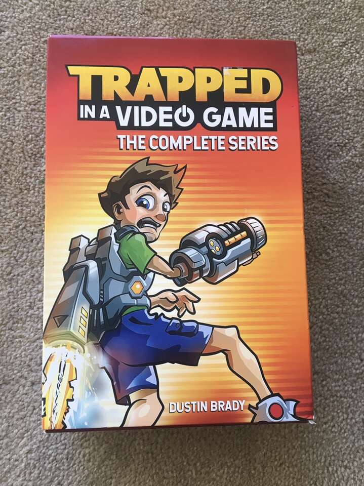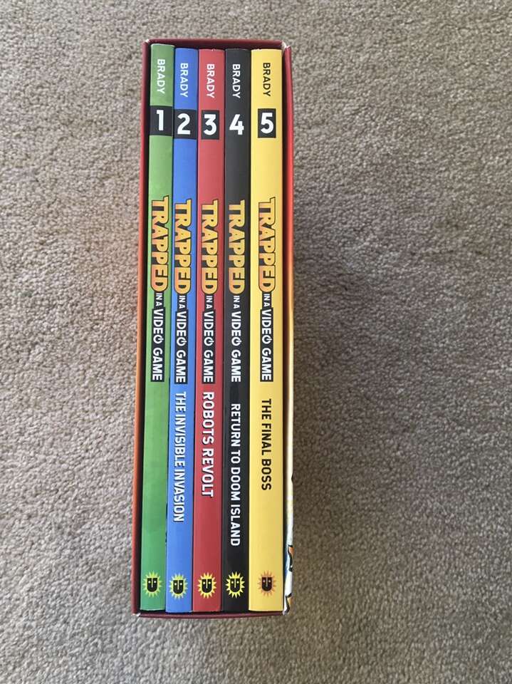 Trapped in a Video Game Complete Series 1-5 box set, by Dustin Brady, illustrated by Jesse Brady: Trapped in a Video Game, The Invisible Invasion, Robots Revolt, Return to Doom Island, and The Final Boss. Ages 8-10. Andrews McMeel Publishing, 2018-2019. Sturdy, oversize paperbacks in excellent condition, with slipcover. Text only. Cash or Venmo. Discount on multiple items.