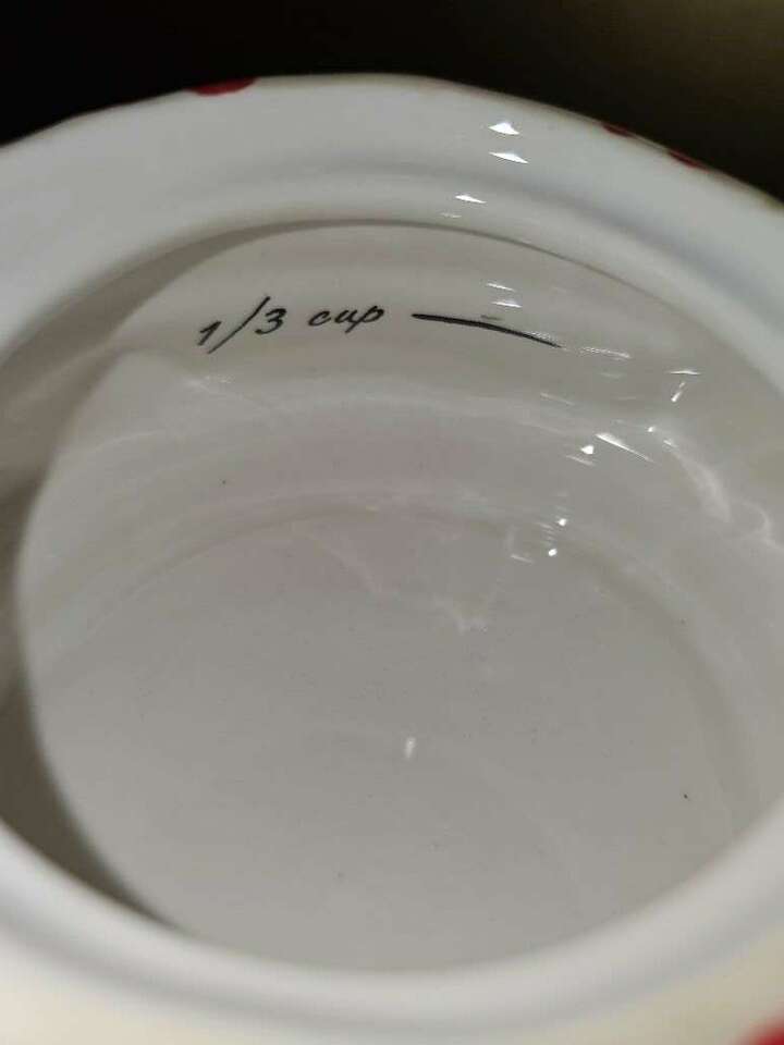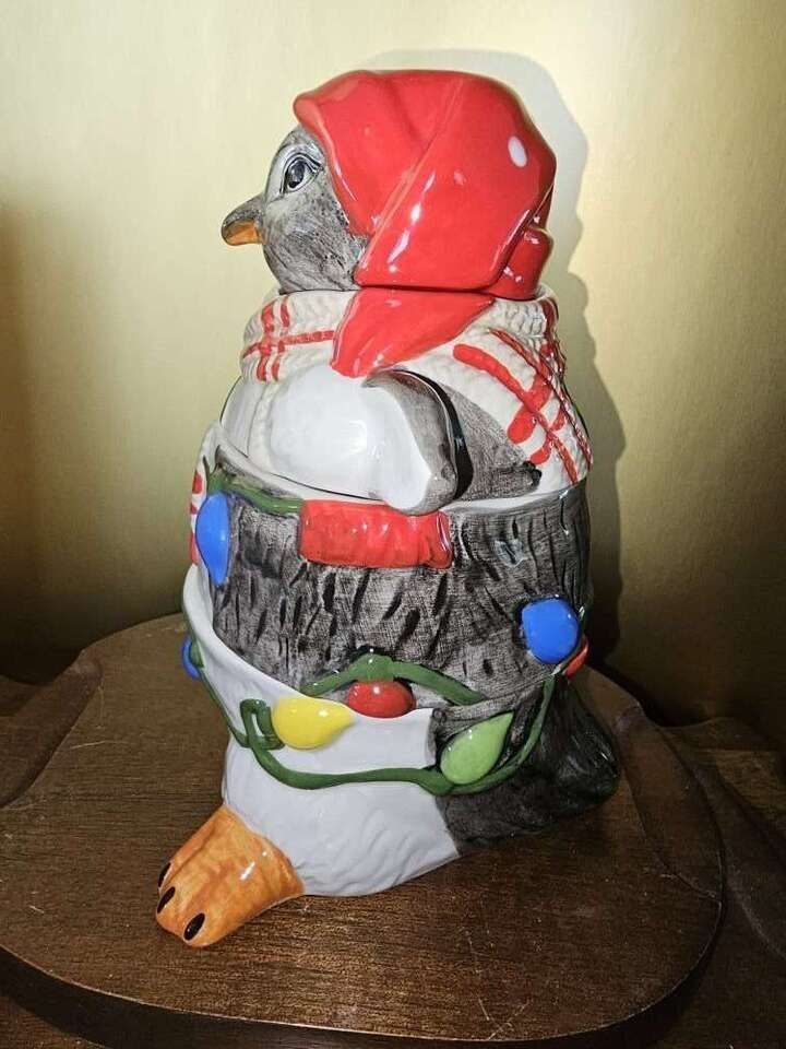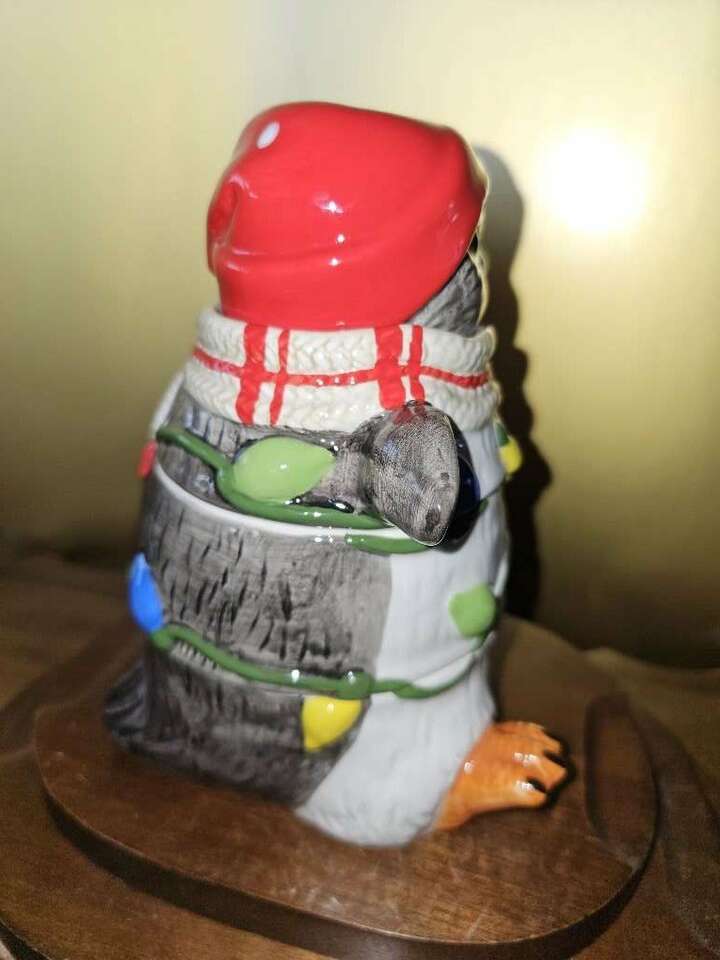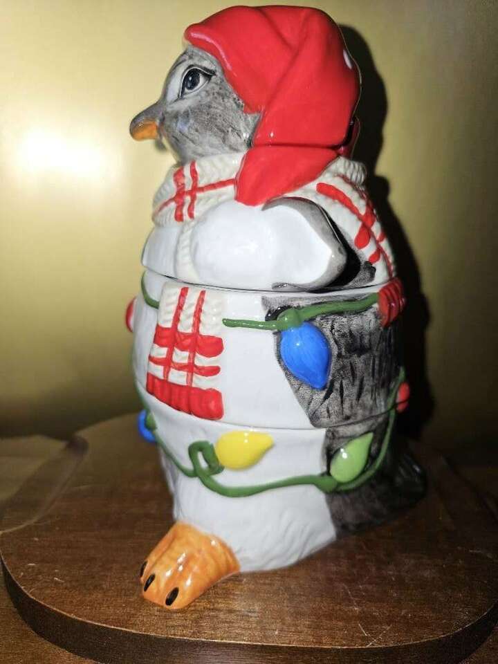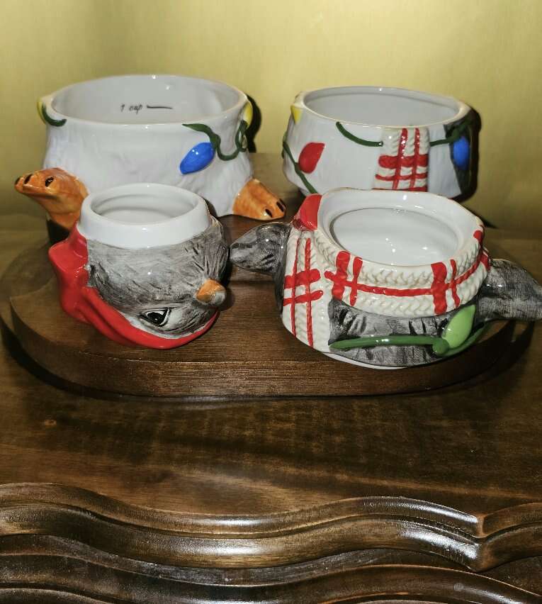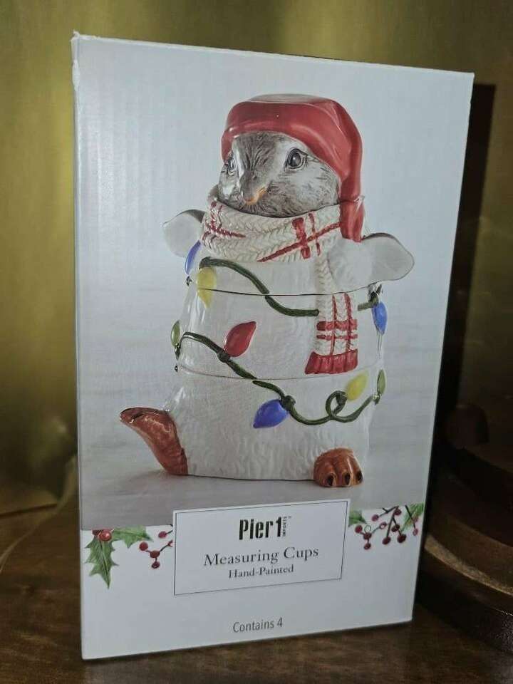 This festive, darling, four piece, Pier One stackable measuring cup set has all been meticulously hand painted. The whimsical penguin doubles as a table top or kitchen shelf decor and can be used to measure one fourth, one third, one half and one cup.