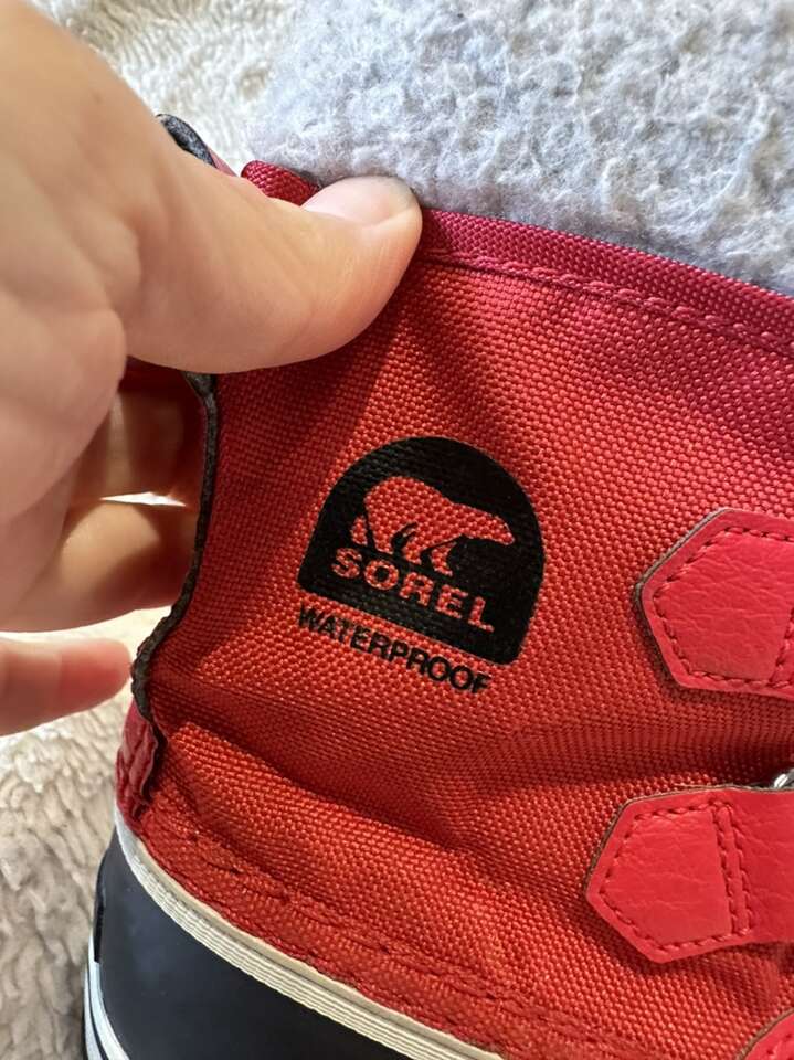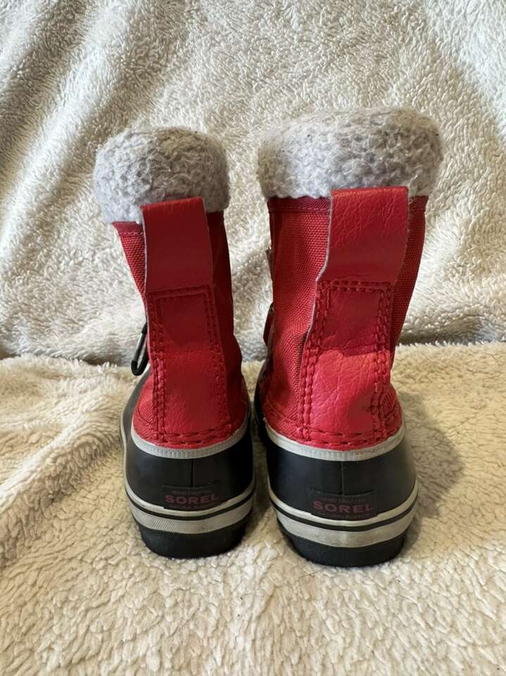 Sorel toddler size 11, waterproof winter snow boots. These have the red canvas uppers and black rubber foot bed. They’re in great condition. See photos for details. Take cash or Venmo, but cash is preferred. Text is best. 8012014446.