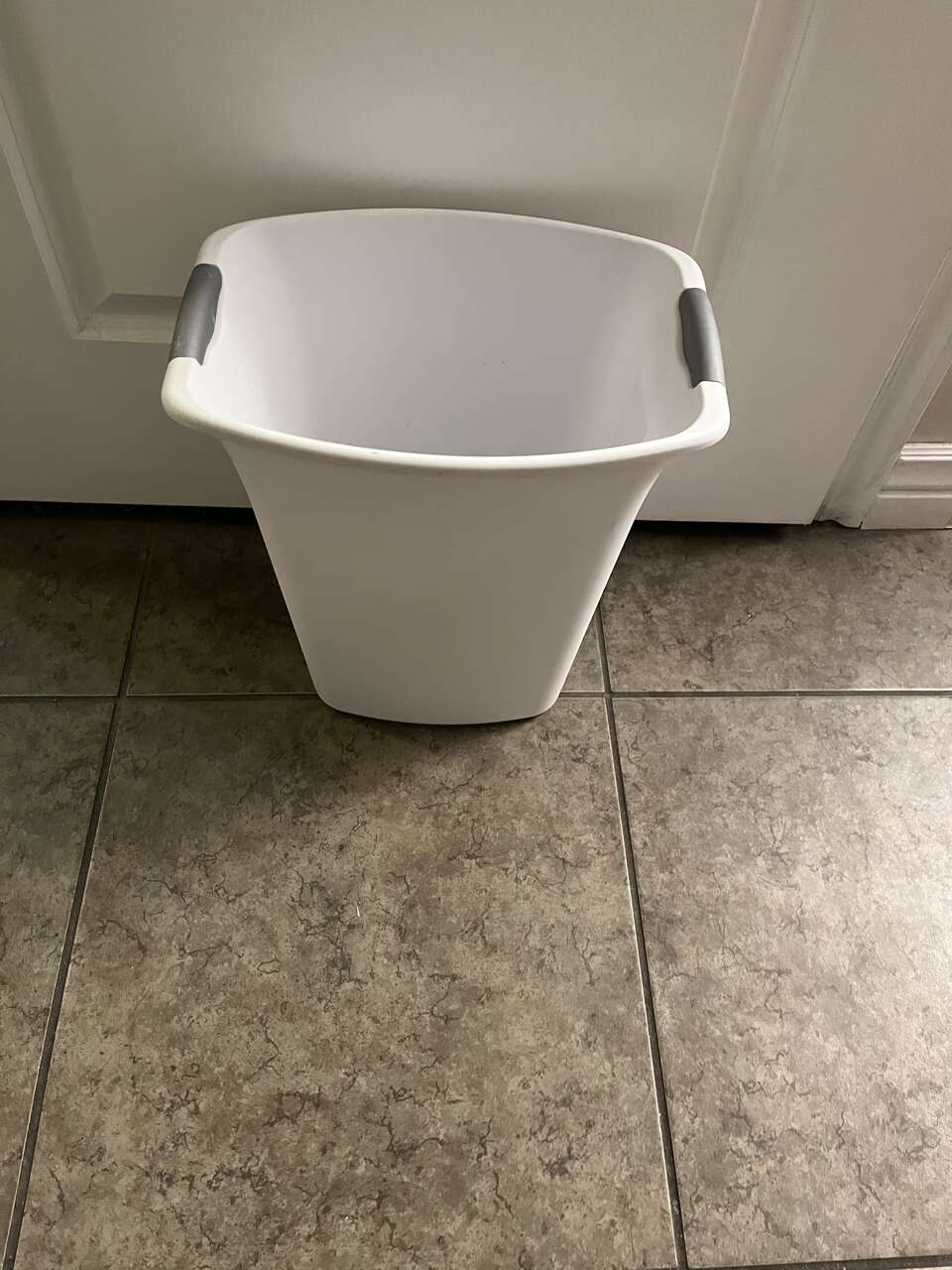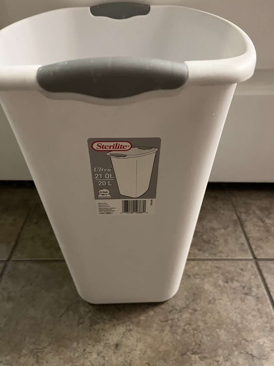 STERILITE 21 Qt. White Wastebasket. Wastebasket features reinforced rims for added strength. The slim decorative shape fits any decor while neatly fitting into tight spaces. This wastebasket is ideal for use in the bathroom, bedroom, study, or under the sink