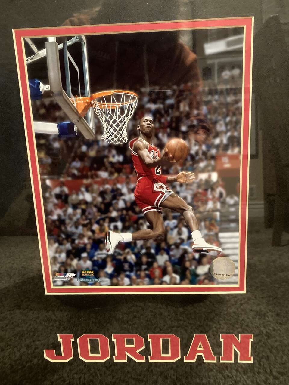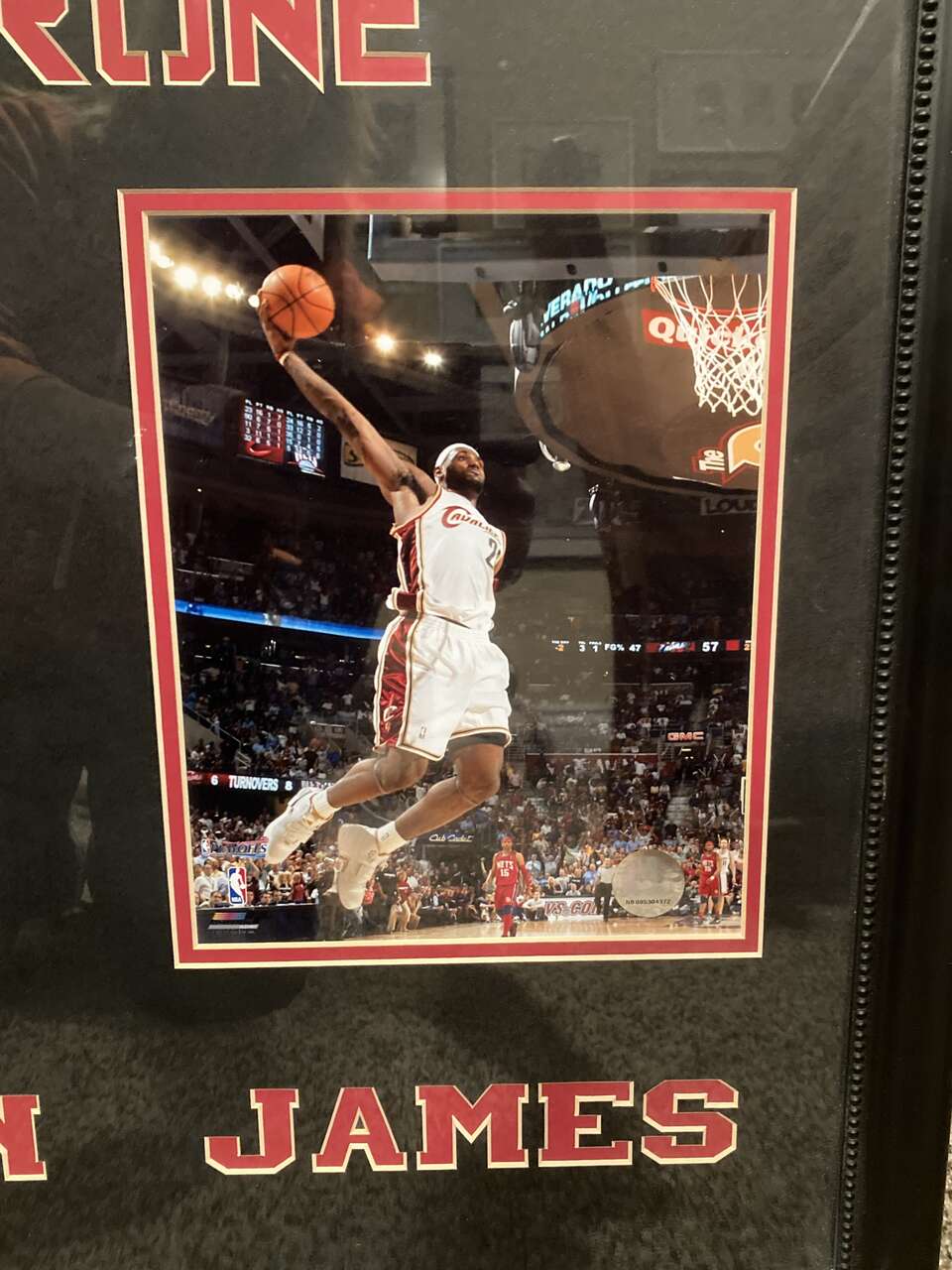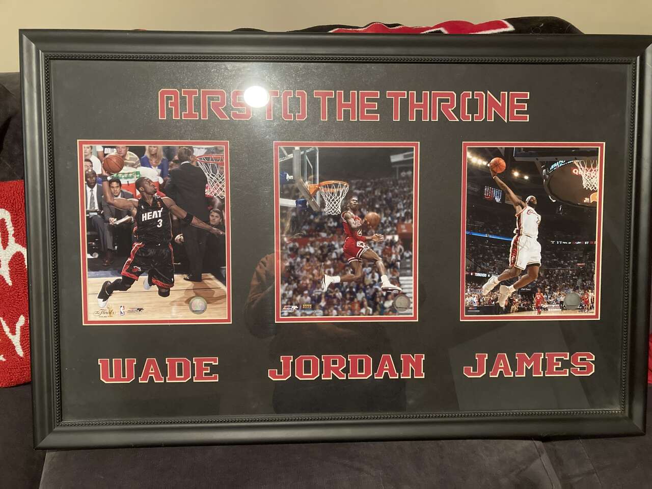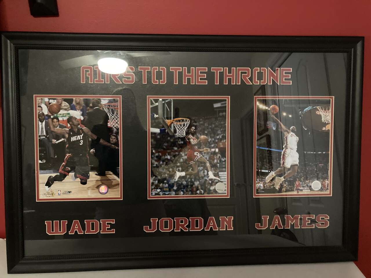 Beautiful Framed Print : Airs to the Throne featuring basketball legends Dwayne Wade, Micheal Jordan and LeBron James. Measures 34 x 22.5 inches. Perfect for the basketball Fan. Text please, Cash only, pick up in Holladay area.