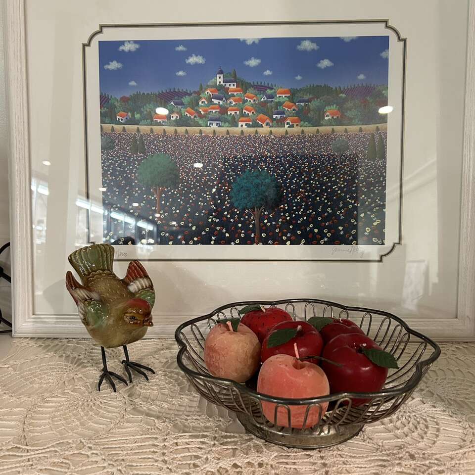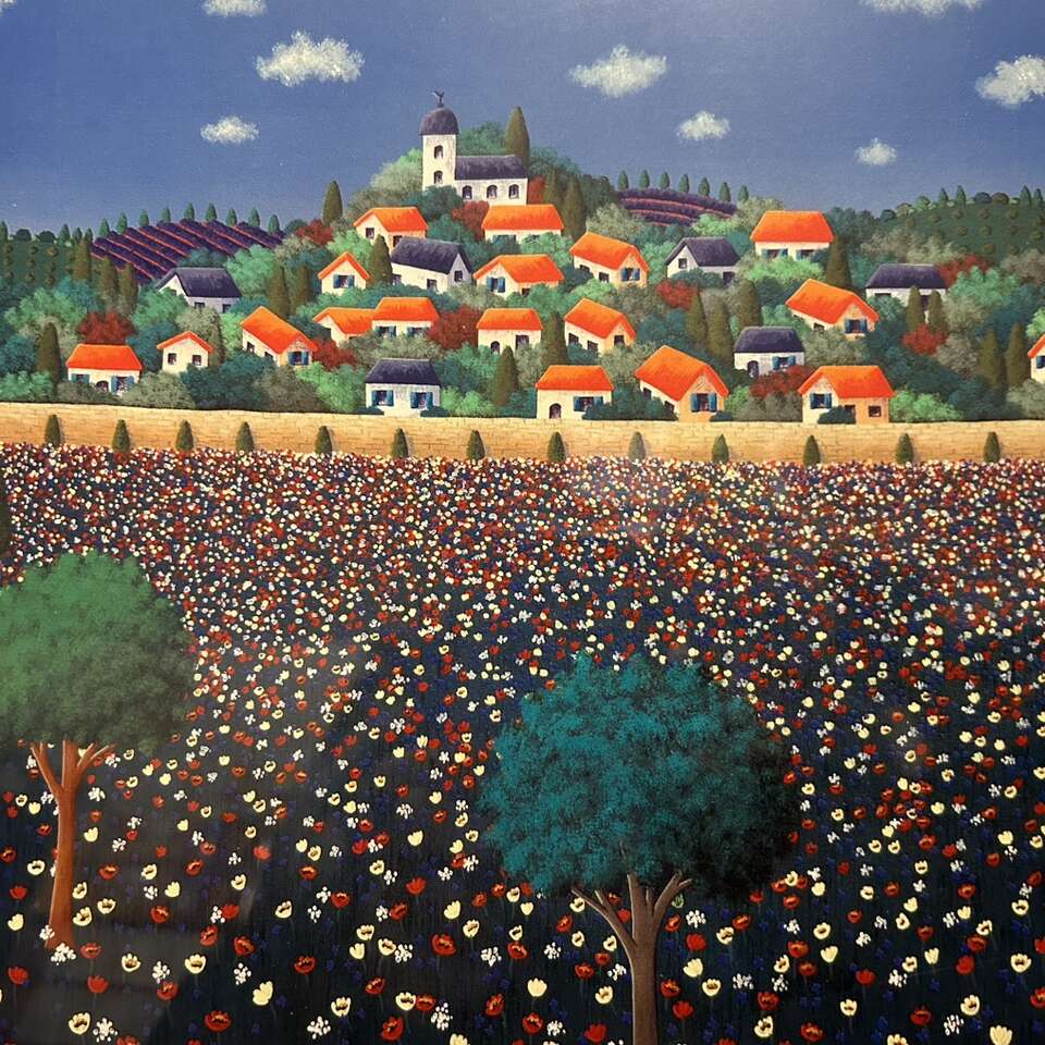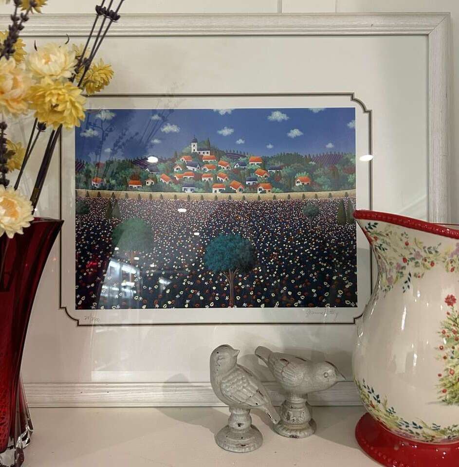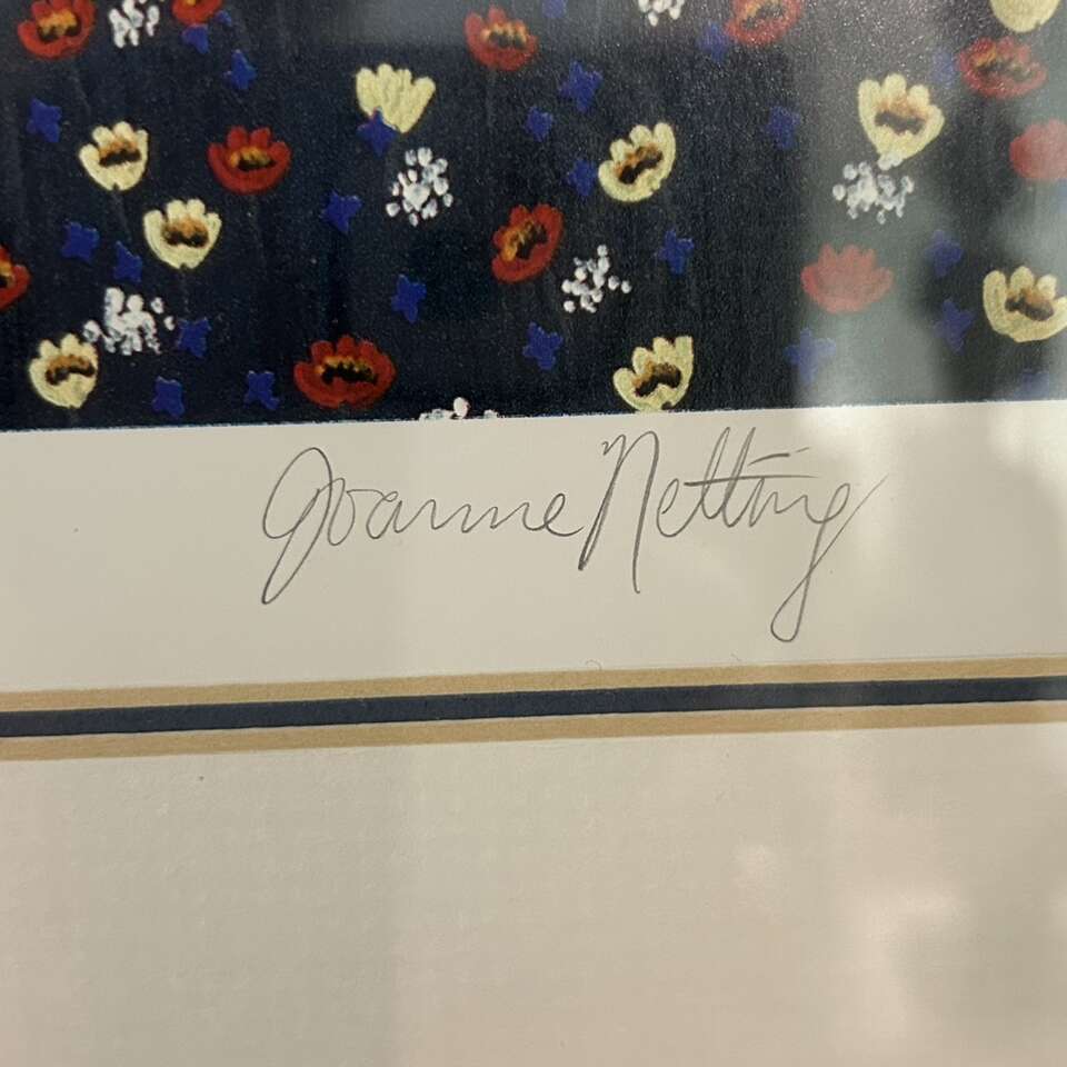 ApplePayGently pre-owned and finely crafted Large 23.5” X 19.5” Limited Edition Signed and numbered: #24 of 2500 serigraph print of a stylized village by Joanne Netting. Village could be in Italy, Greece, Spain, but probably Australia, since that is where Joan is from. Double matted with her signature specialty cut mat and white-washed wooden frame that allows the wood grain to show through.