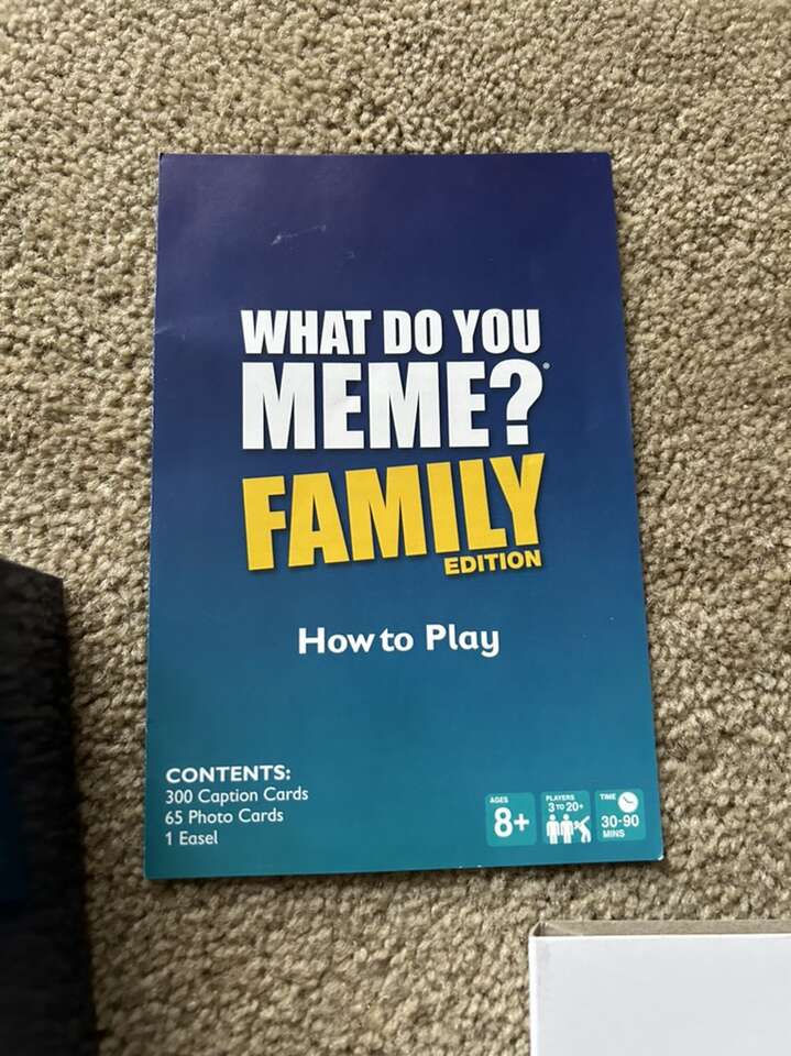 COMPLETE What Do You Meme? Game: Family Edition. Match the funniest caption to the photo to make a meme! The best-selling game, now for families! Ages 8+, 3-20+ players. Complete, no missing pieces. Excellent condition. Text only. Cash or Venmo.