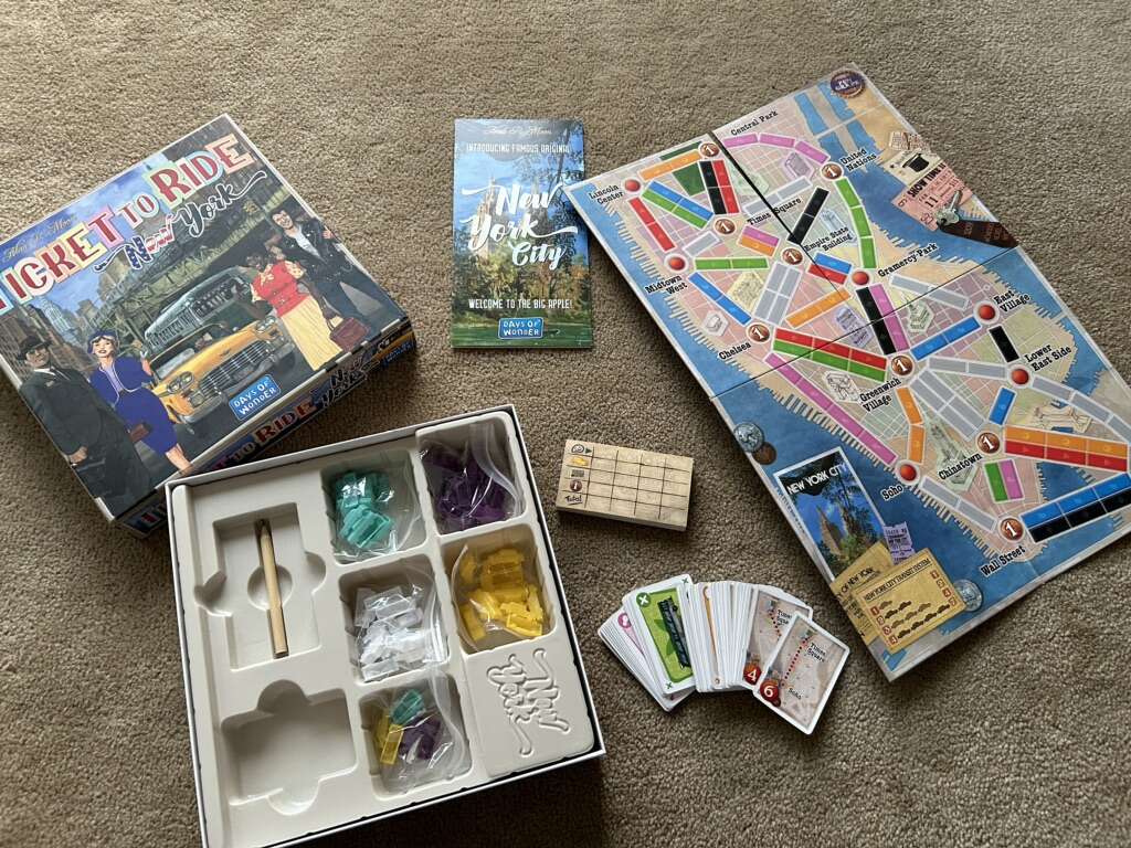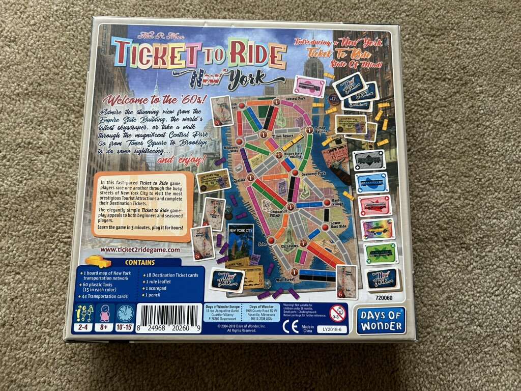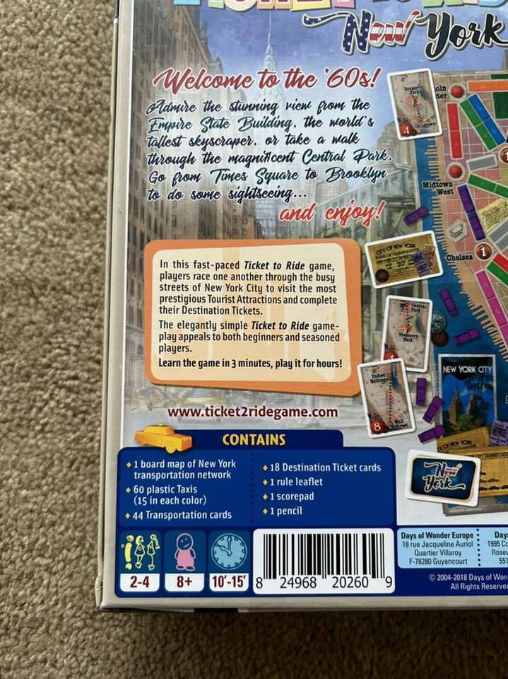 COMPLETE Ticket to Ride: New York. Welcome to the 60s! By Days of Wonder, Alan R. Moon, 2018. A smaller, fast-paced Ticket to Ride game. Ages 8+, 2-4 players. Complete, no missing pieces. Excellent, like new condition. Text only. Cash or Venmo.