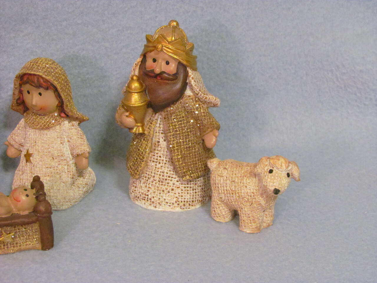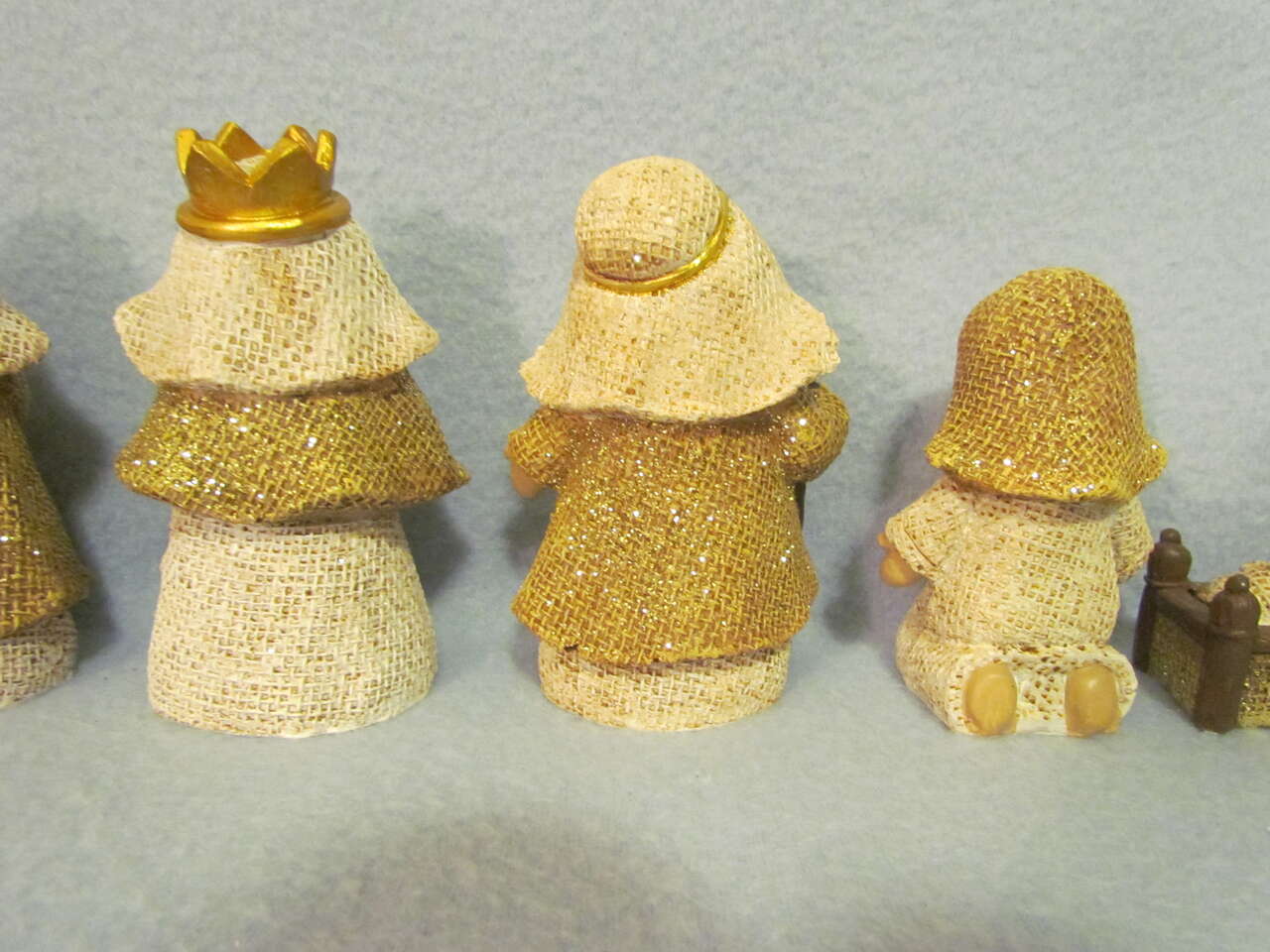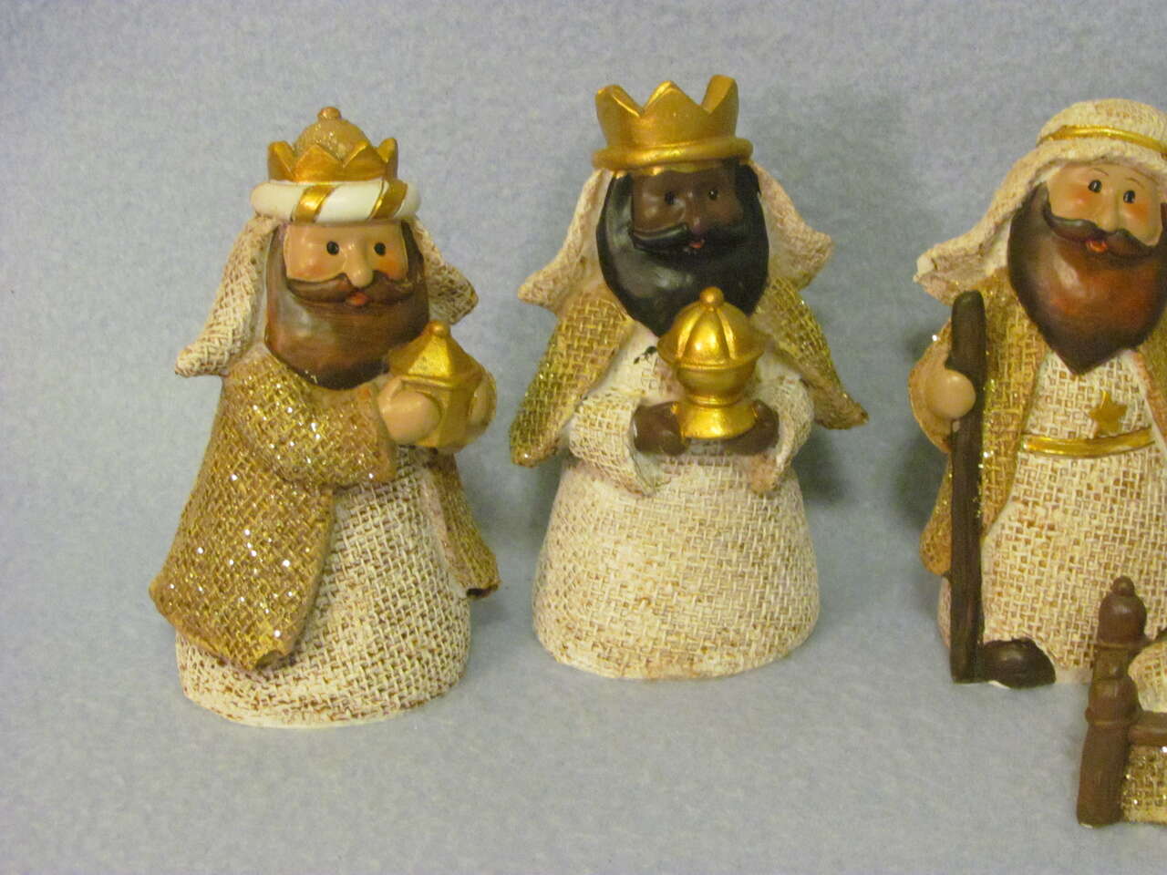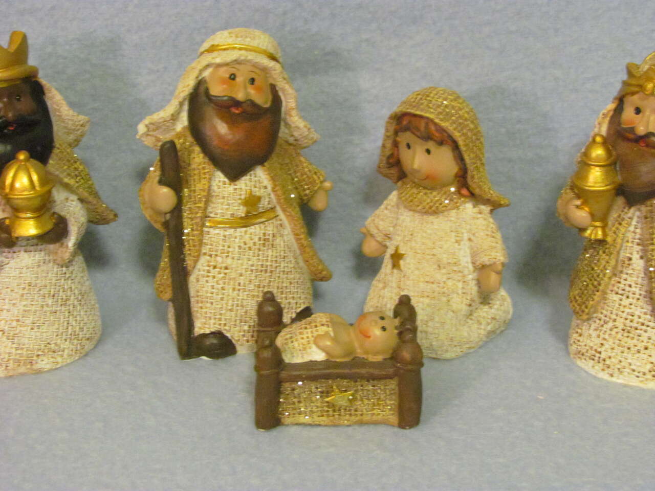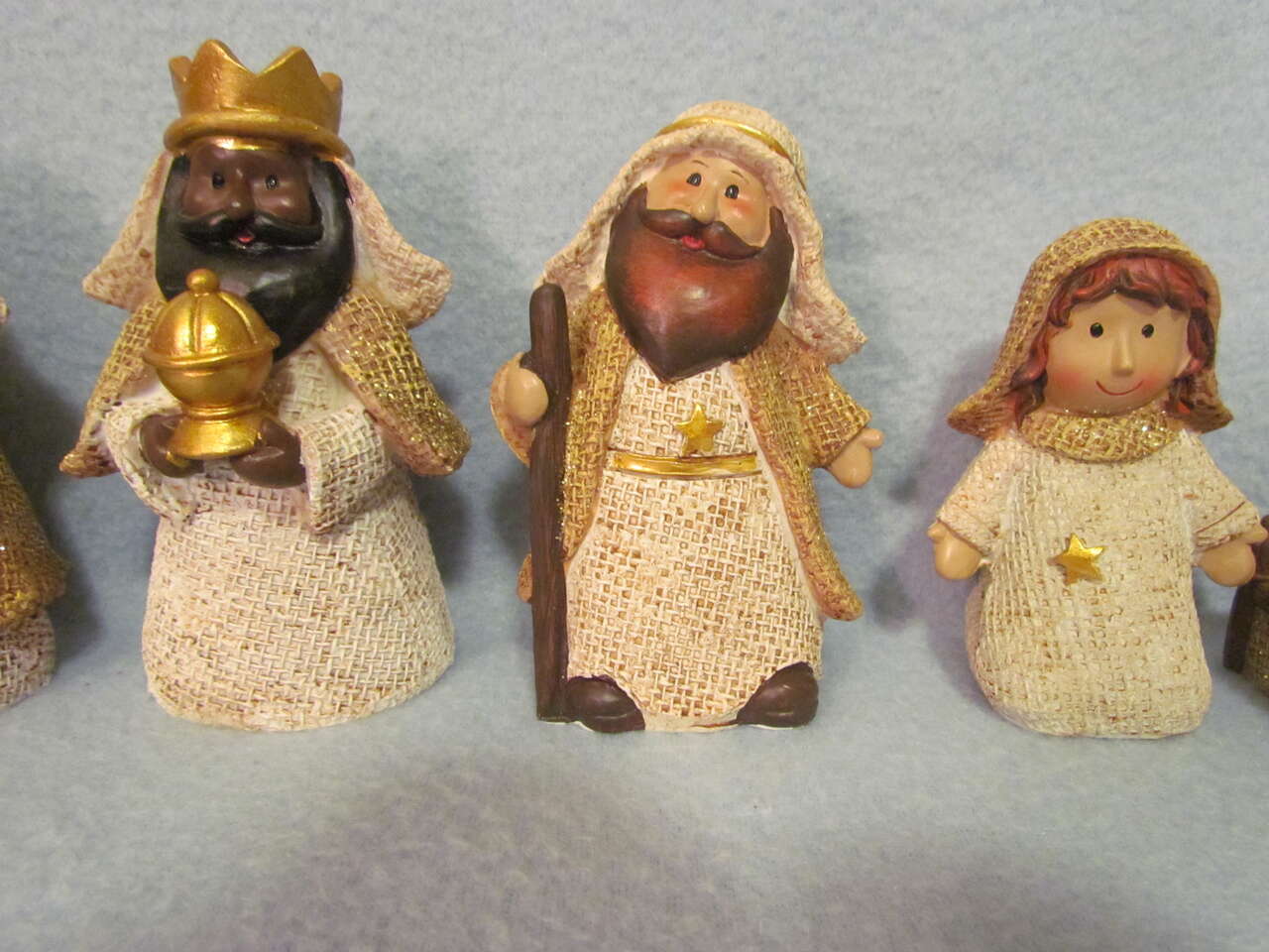 Add a lovely nativity set that brings joyful cheer to your Christmas décor. They are made of 55% polymer resin, 45% calcareousness materials. Figurines measure approximately 2.5 x 2.25 x 4.75 inches. Display on tabletop or nestle on a mantel/shelf. New set of 7. (This set is supposed to come with a donkey animal as well, but this set came without it.)