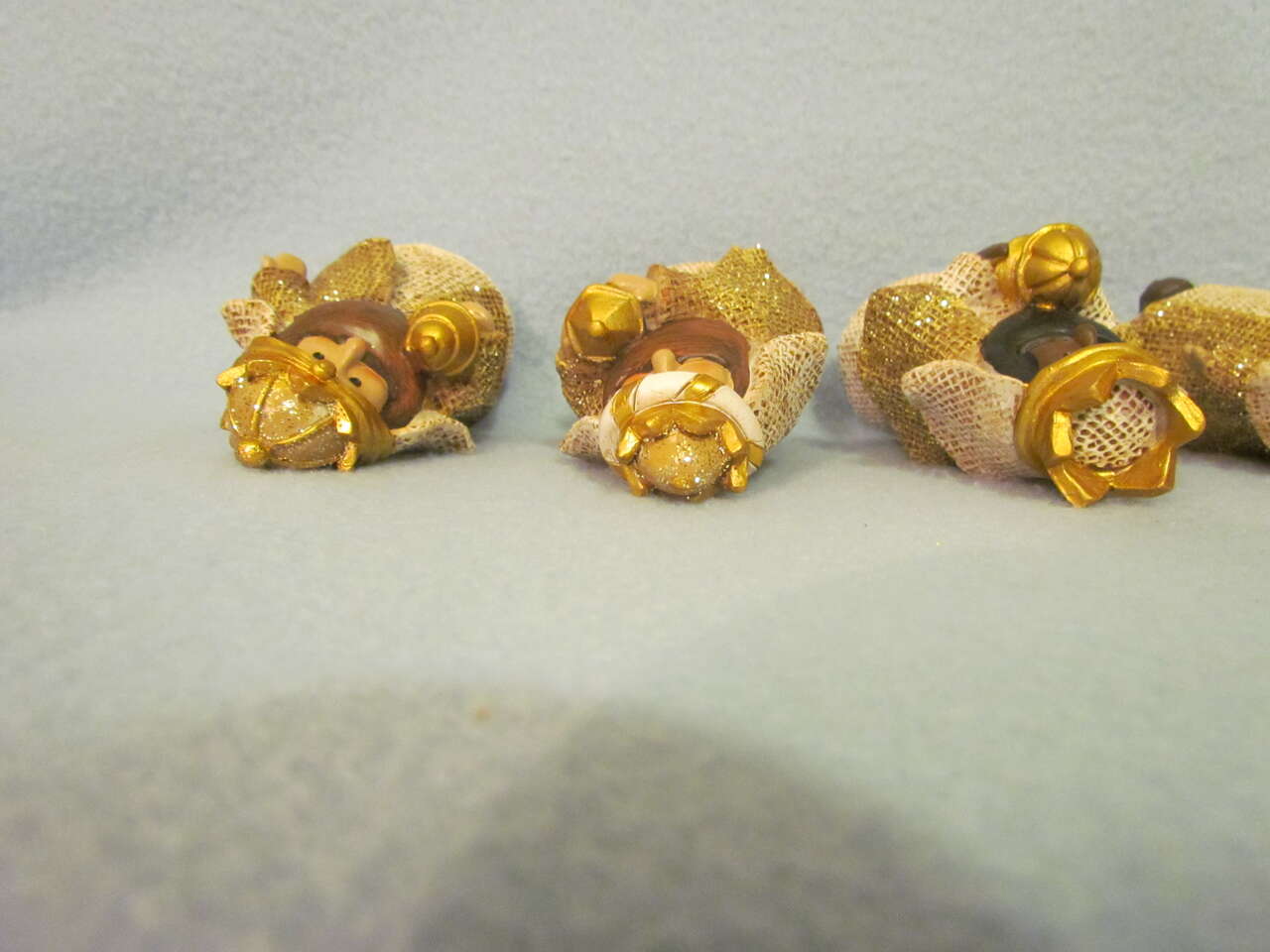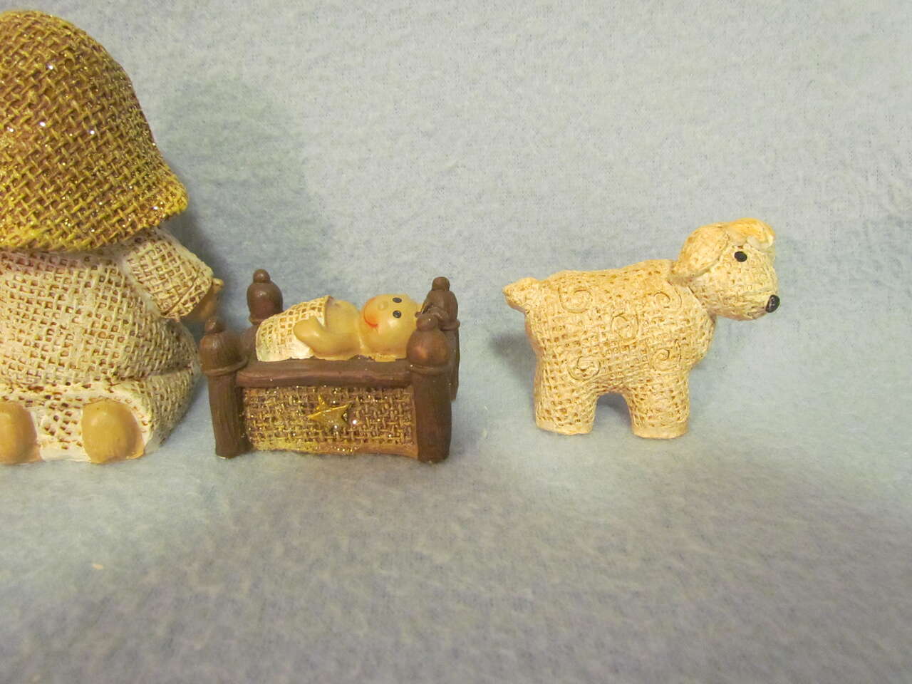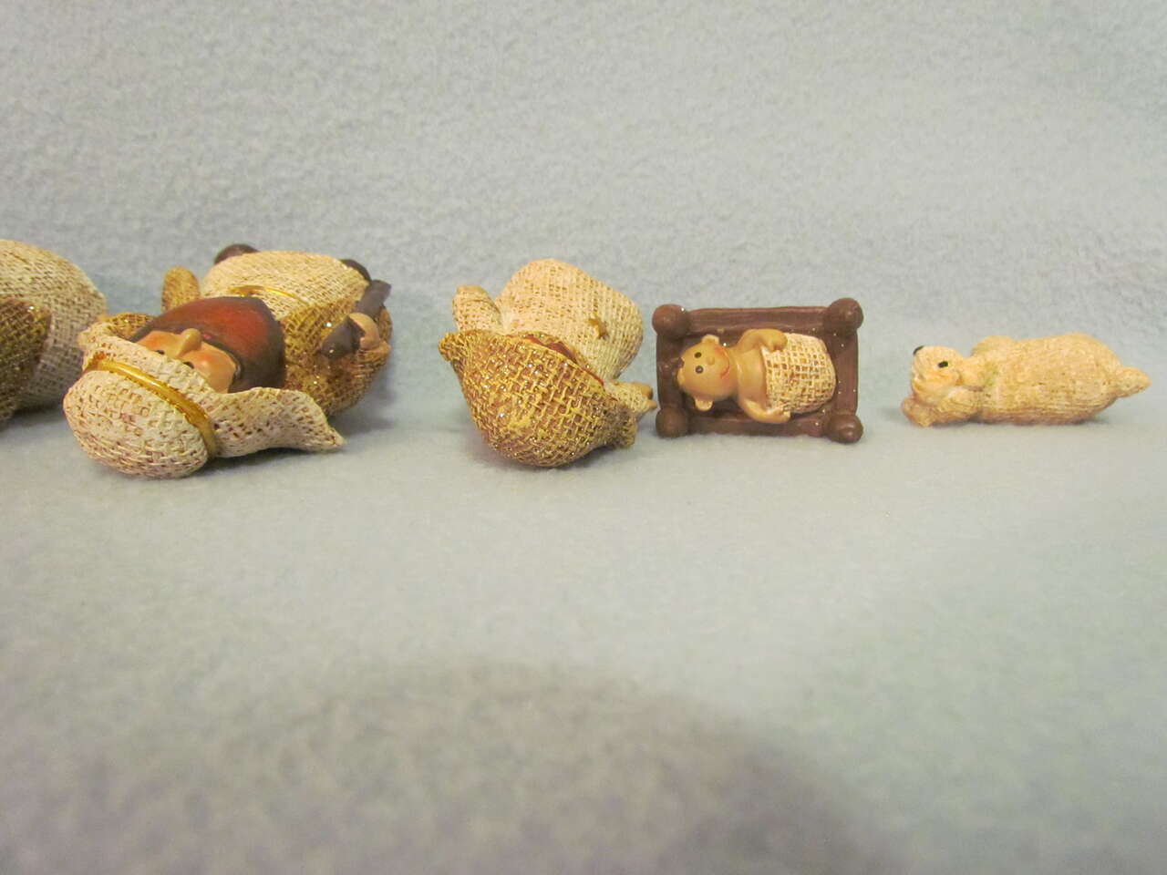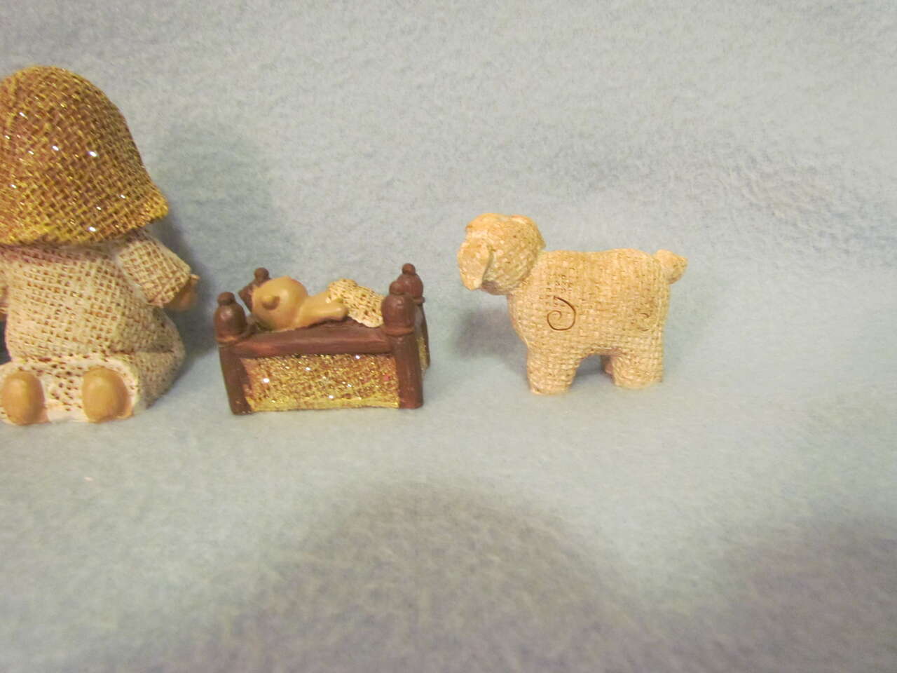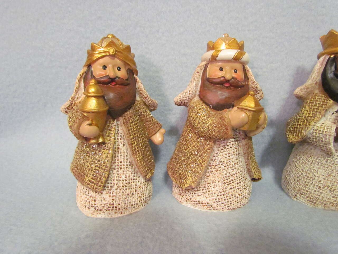 Add a lovely nativity set that brings joyful cheer to your Christmas décor. They are made of 55% polymer resin, 45% calcareousness materials. Figurines measure approximately 2.5 x 2.25 x 4.75 inches. Display on tabletop or nestle on a mantel/shelf. New set of 7. (This set is supposed to come with a donkey animal as well, but this set came without it.)