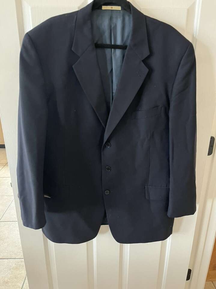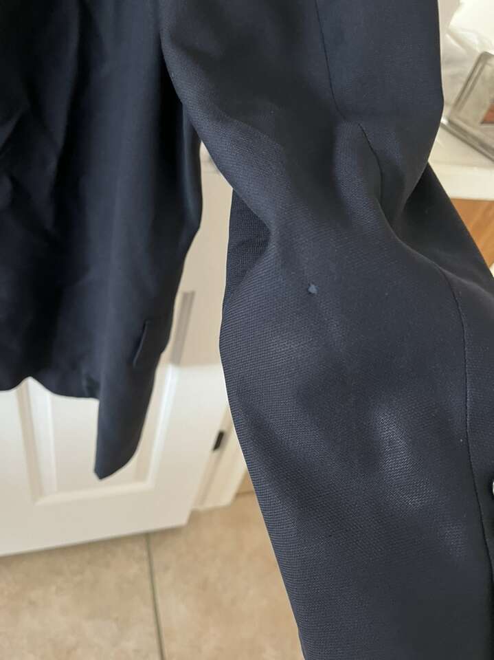 Men’s suit coat navy blue Joseph Abboud brand 46L has a tiny hole in back of sleeve.