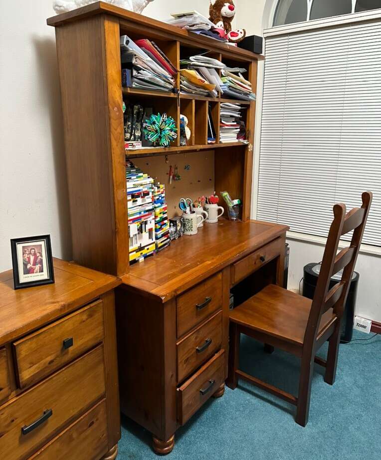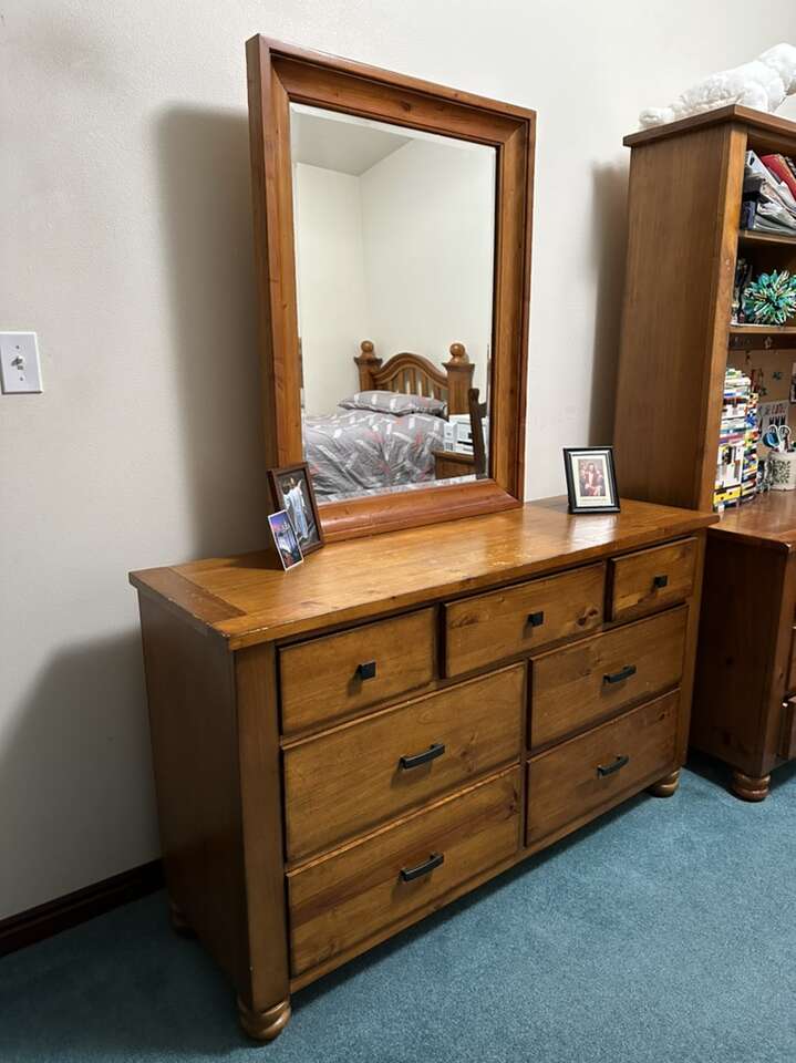This is a twin bedroom set with a dresser, desk, chair, nightstand, and a bed
