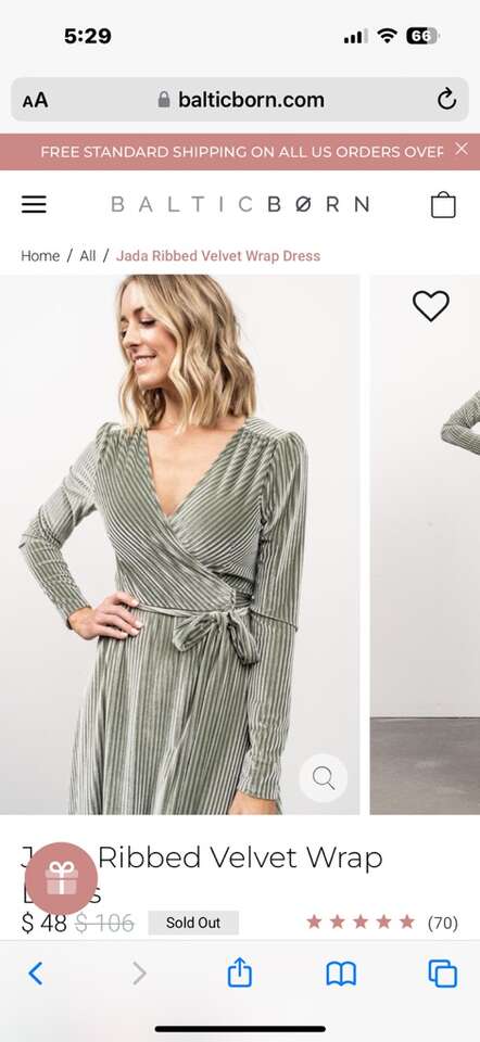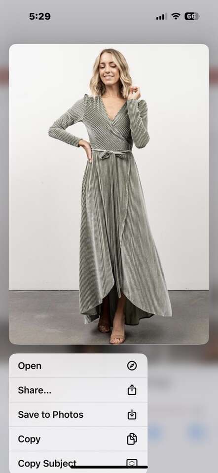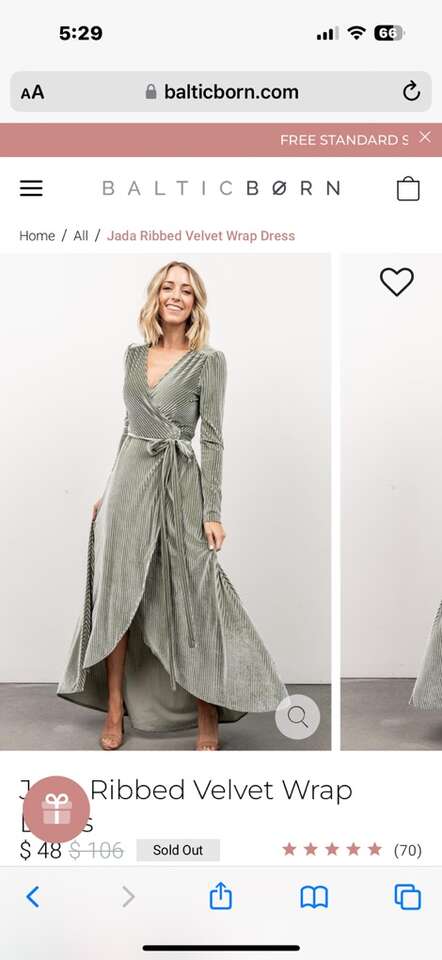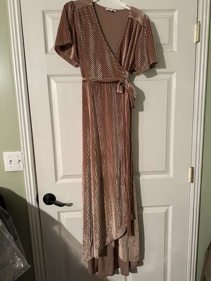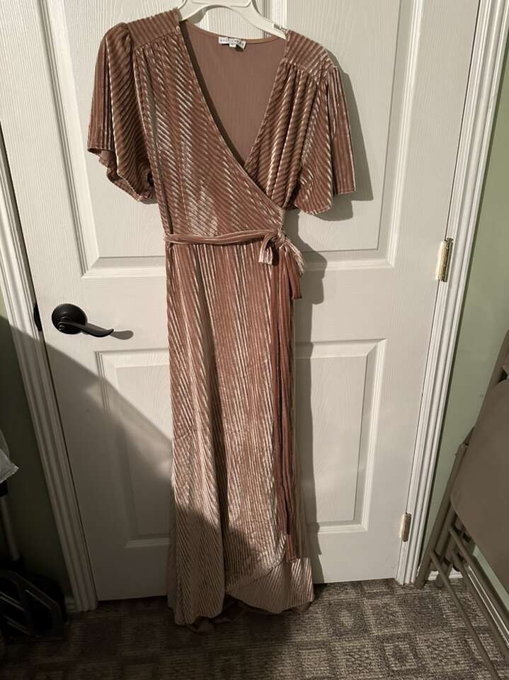 Bought this velvet dress for my daughter’s wedding but the color was not the right shade to match. It was on sale so I cannot return it. So new and very soft. Size is X-LG since I’m a little large chested. It has short sleeves. The green pics are from the company web page so you can see it on a person but it is not long sleeves.