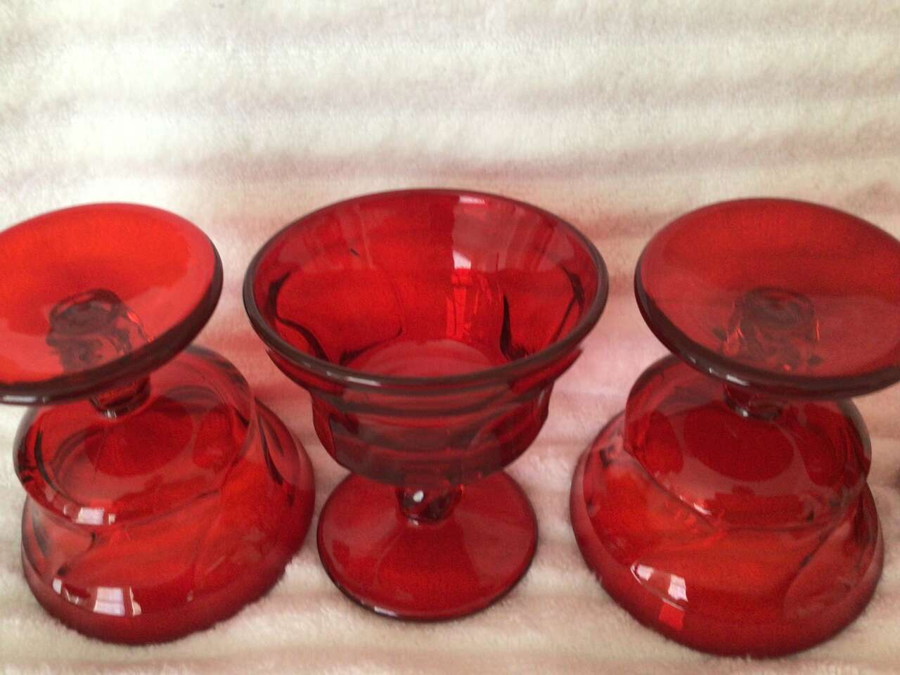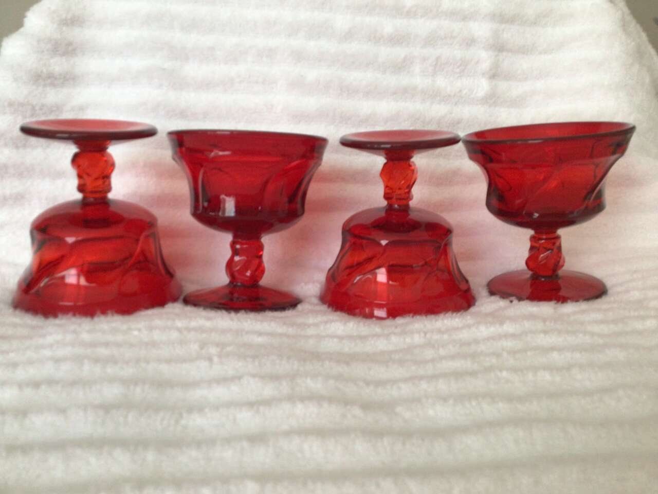 I have 12 each of water and champagne/sherbet goblets made by Fostoria, pattern Jamestown, color is Ruby. These are beautiful, most of them never used. $13 each for water (5 7/8" tall) and $7 each for sherbets (4 1/4" tall). Sold separately; buy as many as you like.
