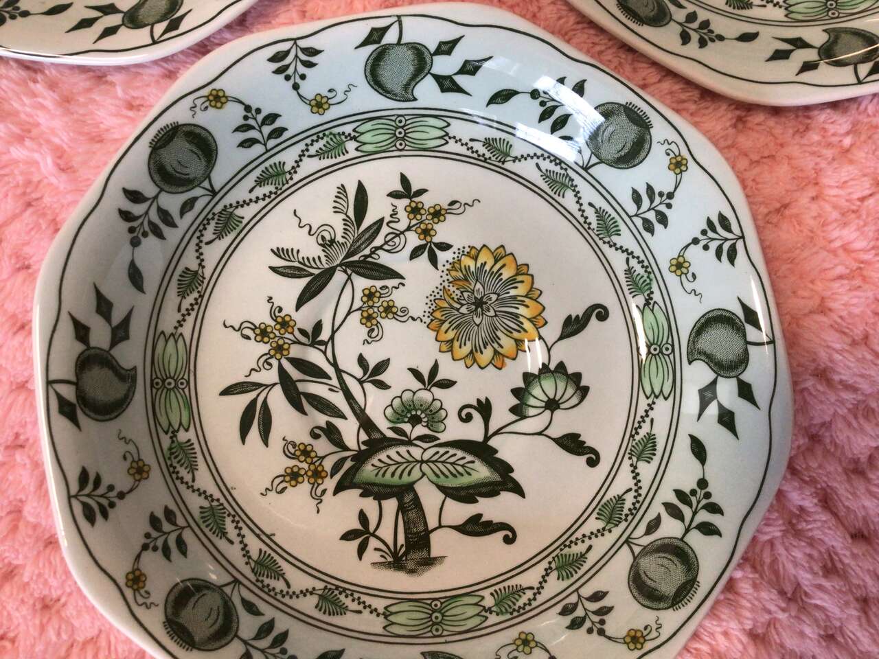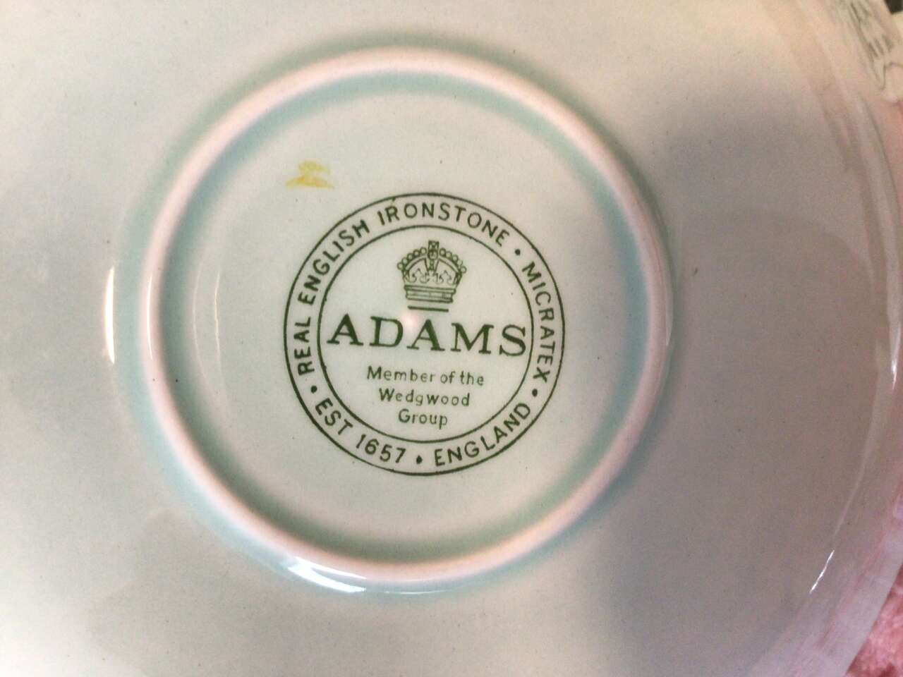 This listing is for 3 saucers, shallow bowl shape, almost 6" across, made by Adams China Co., Wedgwood Group, English ironstone, in green and yellow floral pattern. Two have crazing on the bottom, other than that, excellent condition.