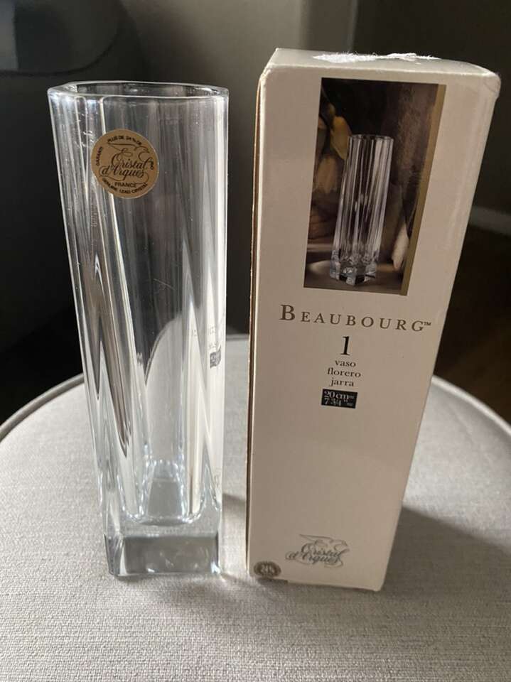 VenmoSimple, yet beautiful glass vase made in France. With a square deep bottom, it measures 8 tall and about 2.25 in diameter at the opening. 24% Lead Crystal. Heavy for it's size. Vintage from the 1990s. Excellent condition with original sticker still on the glass and in original box. Perfect for weddings, anniversaries, birthdays, holidays, and other special events.