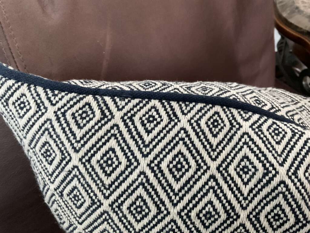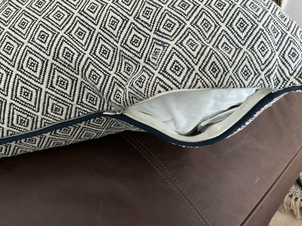 Nice soft throw pillow with down filling. It’s a blue and white throw. Zips for cleaning and access 20x20