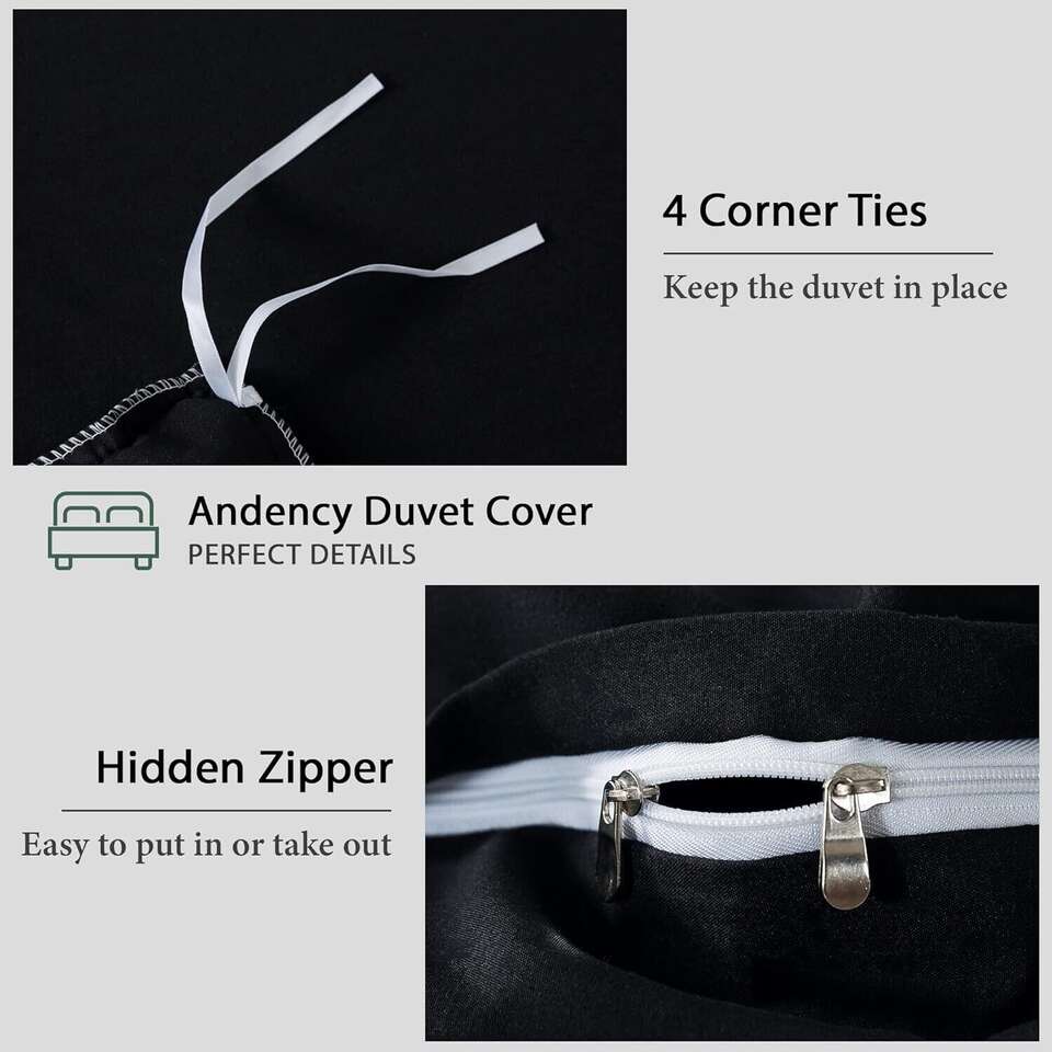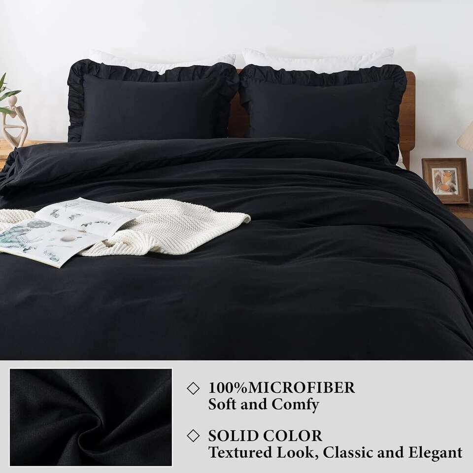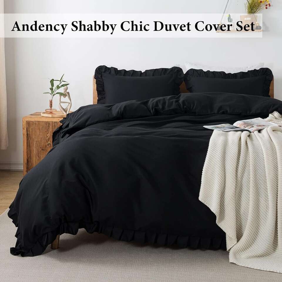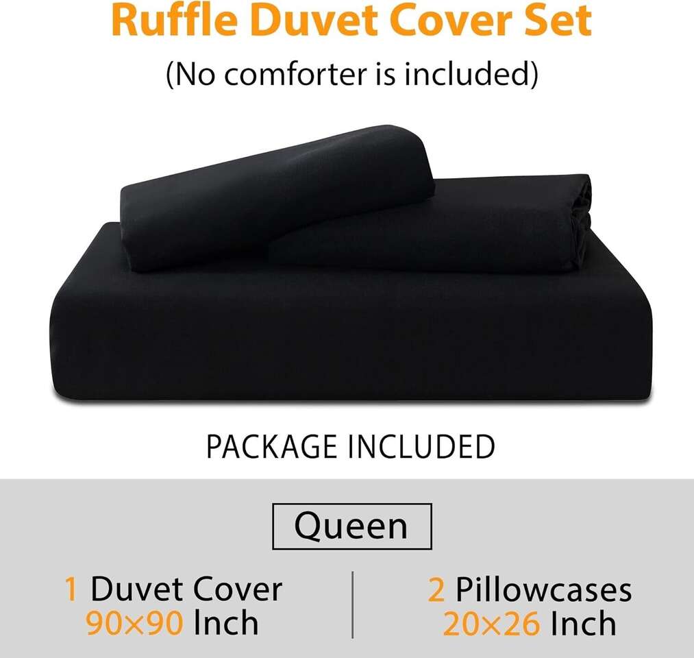 [Black Ruffle Duvet Cover]Andency black duvet cover set adopts vintage ruffle fringe, modern farmhouse style, cute and elegant. There are beautiful ruffles on 3 sides, give you a chic, textured addition to your bedroom decor. Our black ruffled duvet cover set comes with solid color design, simple but stylish. Black duvet cover is suitable for any room, such as a bedroom, guest room, kids room, vacation room, and so on. [Queen Duvet Cover Set] 3 pieces queen duvet cover set Includes 1 ruffle duvet cover (90"x 90") and 2 pillowcases(20"x 26") Our duvet cover set comes with envelope pillowcases, which are simple and convenient (There are no zippers on the shams). Please confirm your bed size before purchasing. Please kindly note that the comforter, duvet, or pillows are not included. [Ultra-Soft Microfiber] Our ruffle duvet cover set is made from microfiber (no insert is included). This microfiber duvet cover bedding set is soft, breathable, and lightweight. It can bring you a comfortable touch and a warm experience. At the same time, ruffled duvet cover isn't heavy but is a sturdy weight so it will hold up well. You can enjoy a sound and sweet sleep all through the night. [Multiple Purpose] Such a lovely shabby chic duvet cover will appeal to all tastes. The modern look of the black ruffle softens it, making it look less severe. The solid color is neutral looking and goes well with most decor. Our ruffled duvet cover set is suitable for your daughter to get a lovely bedroom style or updates her bedroom into a princess palace. Or it can complete your farmhouse, shabby chic, French Country, minimalist, or traditional bedroom design perfectly.