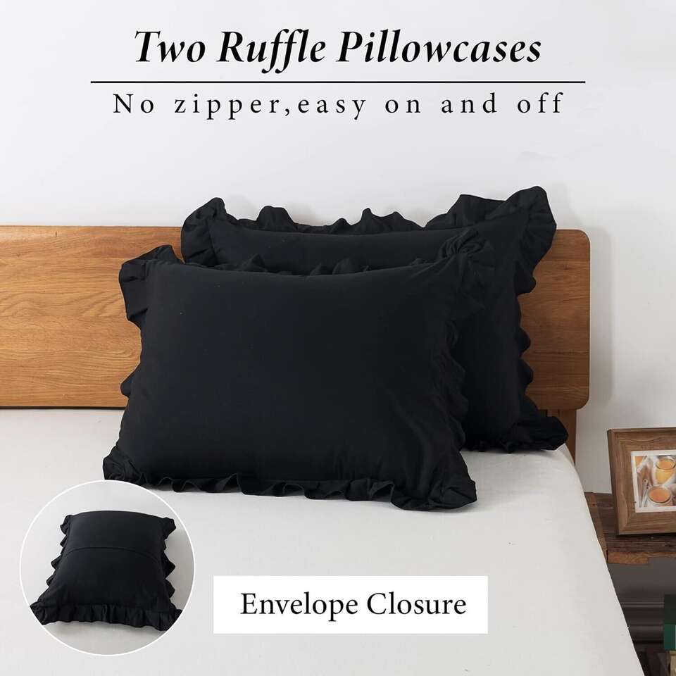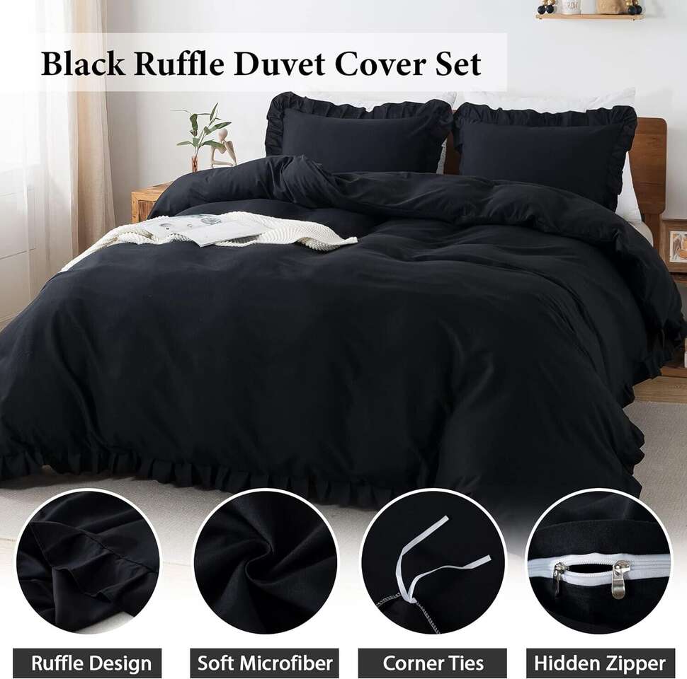 GooglePayBlack Ruffle Duvet Queen Comforter Cover Set Pillowcases Soft Microfiber Bedding