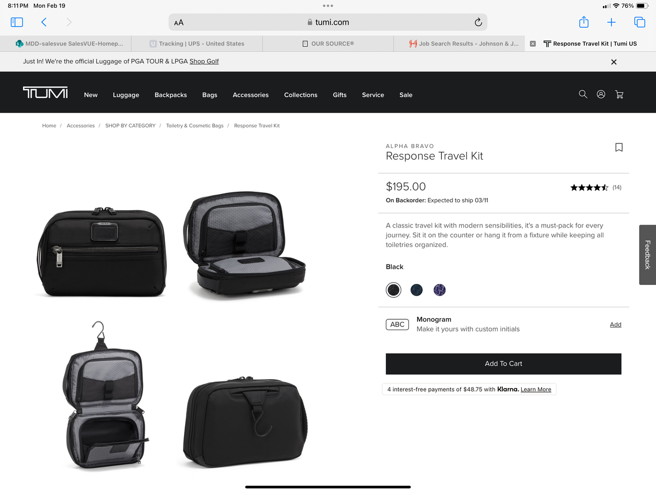 Brand new Tumi Response Travel Kit - I received this as a gift but I already have a travel kit. This is their latest model that retails for $ 195 + tax. It's a great kit - lots of space with one of the pockets lined with rubber in case anything leaks. See more details on Tumi's website. City Creek will monogram it at no charge. Thanks for looking - please message/text with any questions. FIRM on the price - I'll keep as a back up for anything less so please don't waste either of our time asking