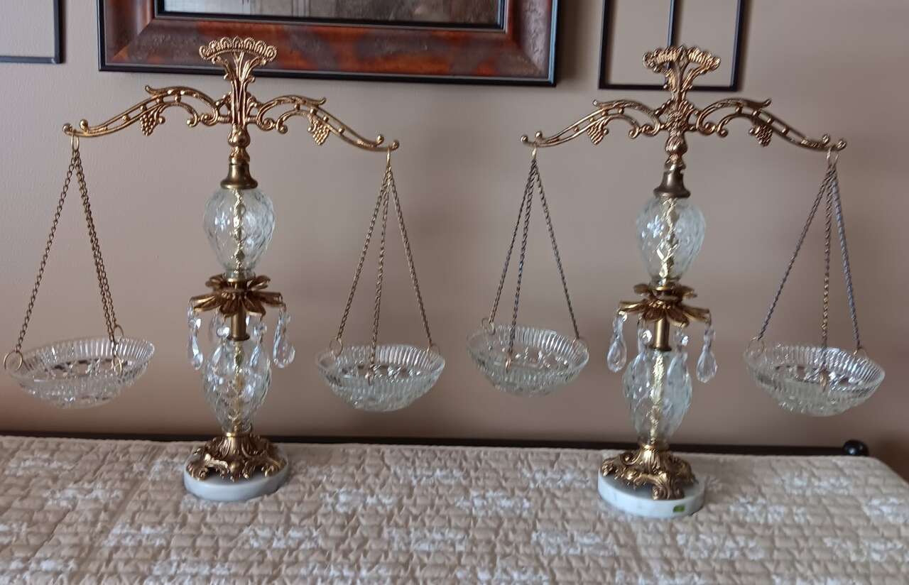 I have 2, 20" Italian brass scales of Justice made of brass marble and glass. Also have a 11" candy dish and a pair of 9" candlesticks, also made of brass ,marble and glass. All for $100 Will sell individually. Candlesticks will have to sell as a pair. If interested, I will consider all offers. Call or text Terri @ 801-791-6328