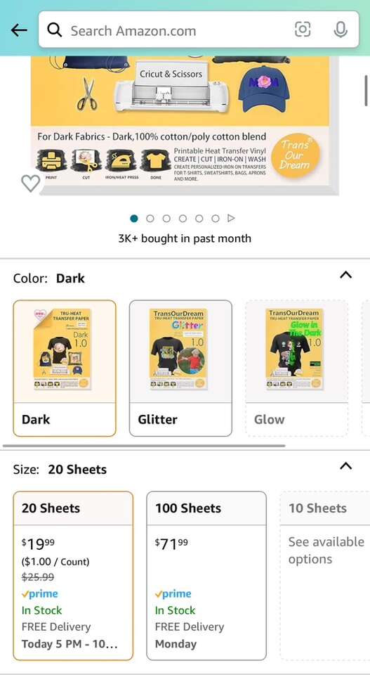 This is 20-pack, I used 2 sheets, 18 remaining. Worked great for a Halloween costume - printed on my regular at home printer, and used my Cricut heat press on a denim vest. This is for dark fabric.