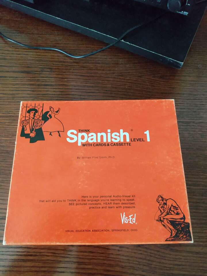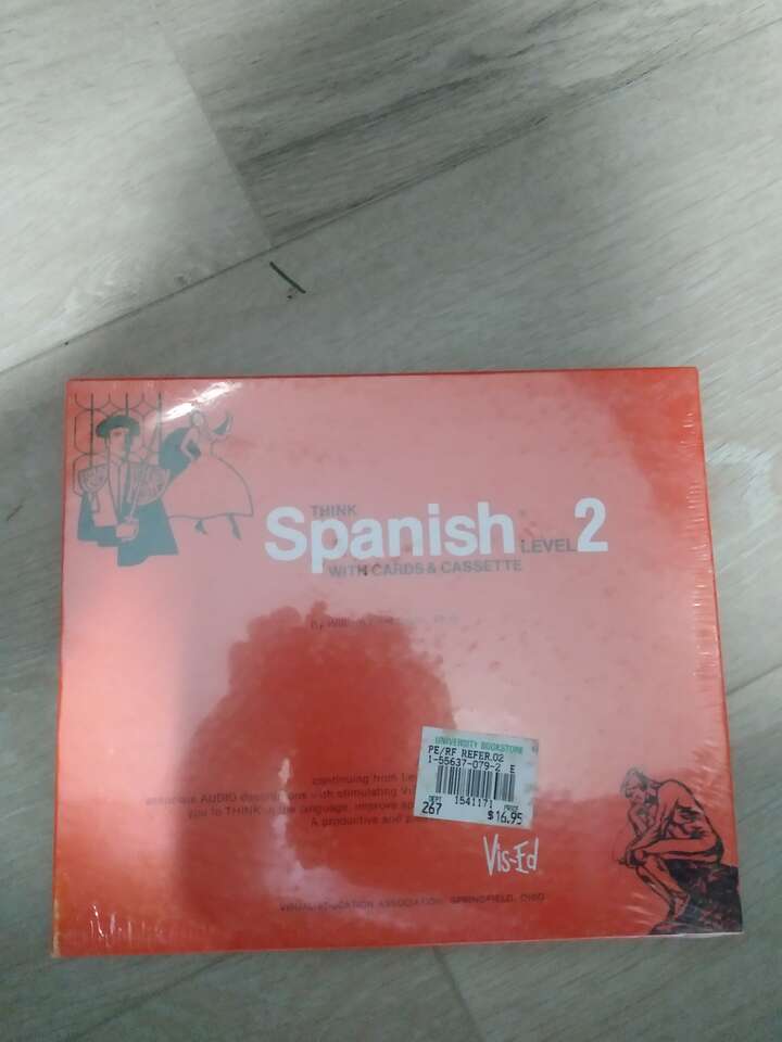 learn spanish with think spanish level 1 and 2 with cards and cassette. Level 1 is lightly used and level 2 is a new unopend package. Purchased at the university bookstore for $16.95 each I will sell both for $10