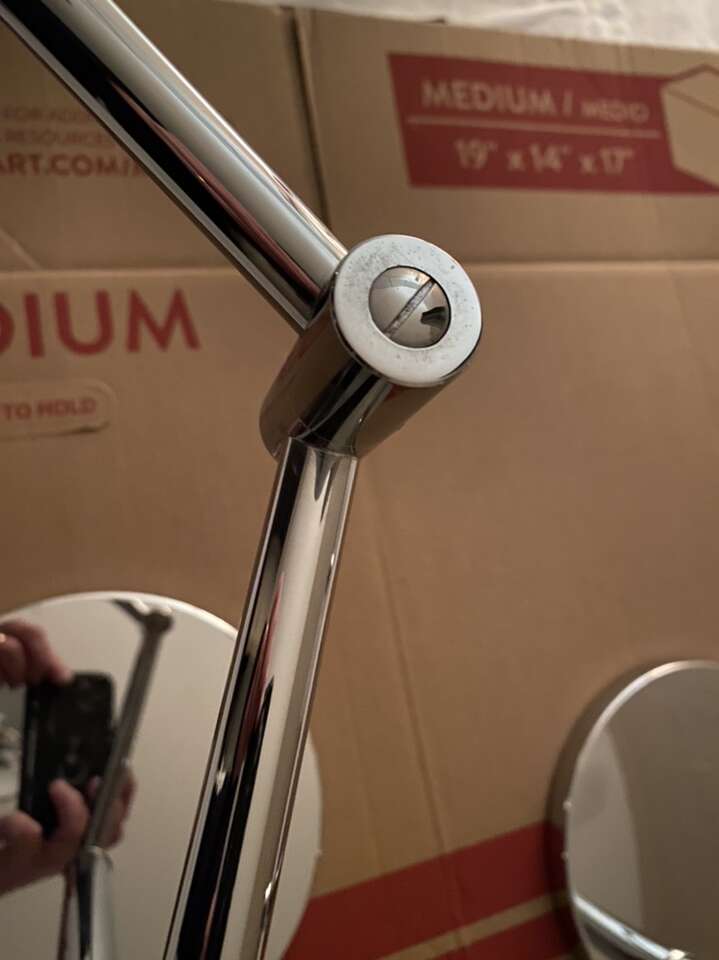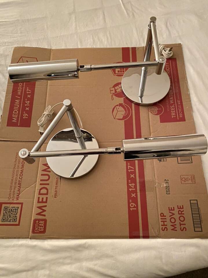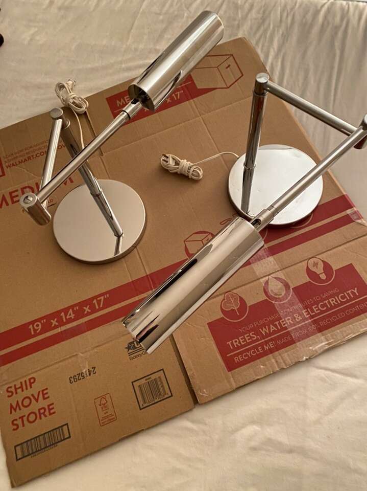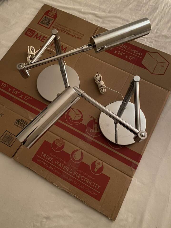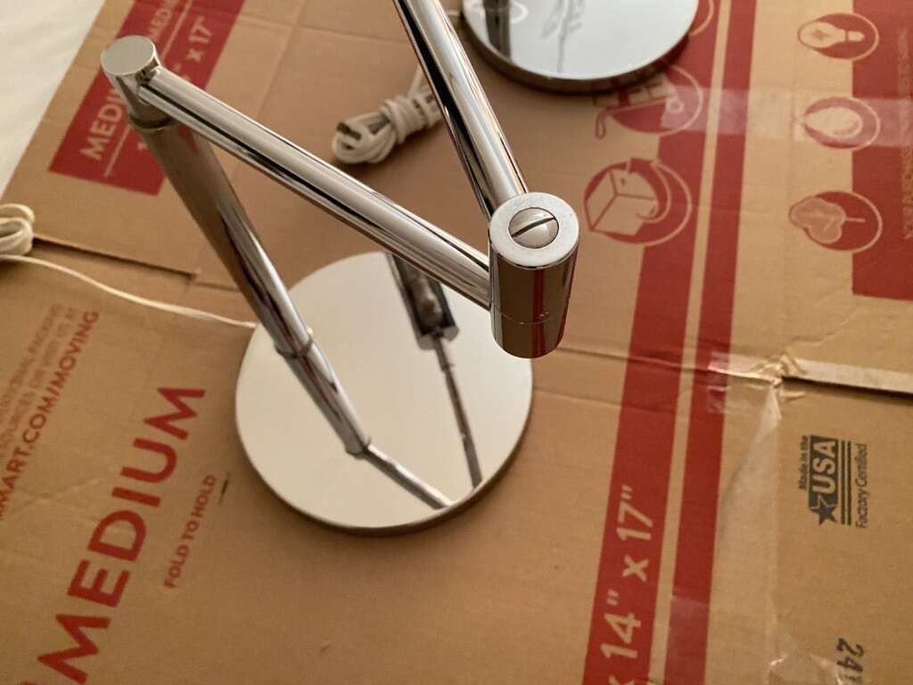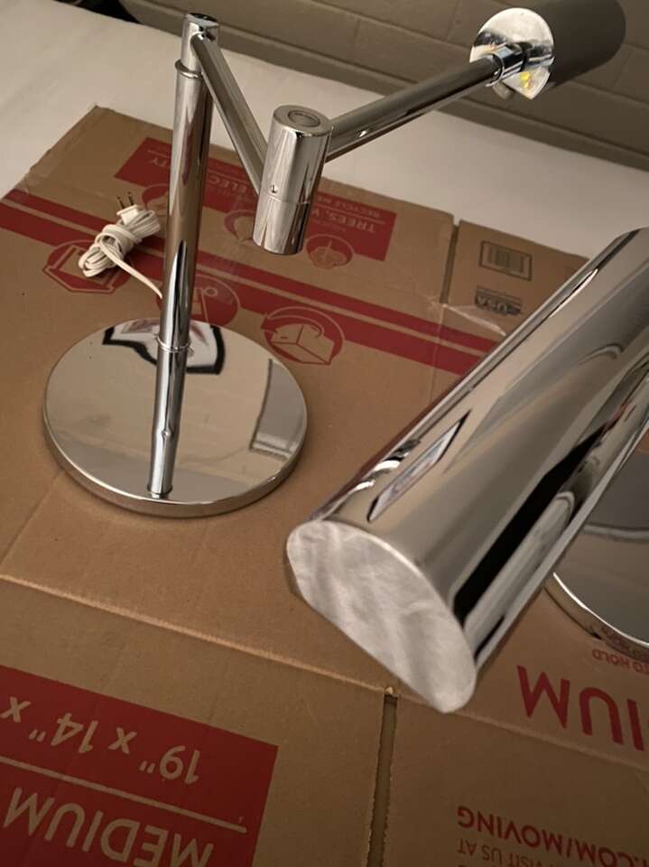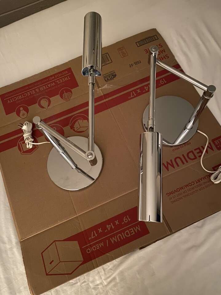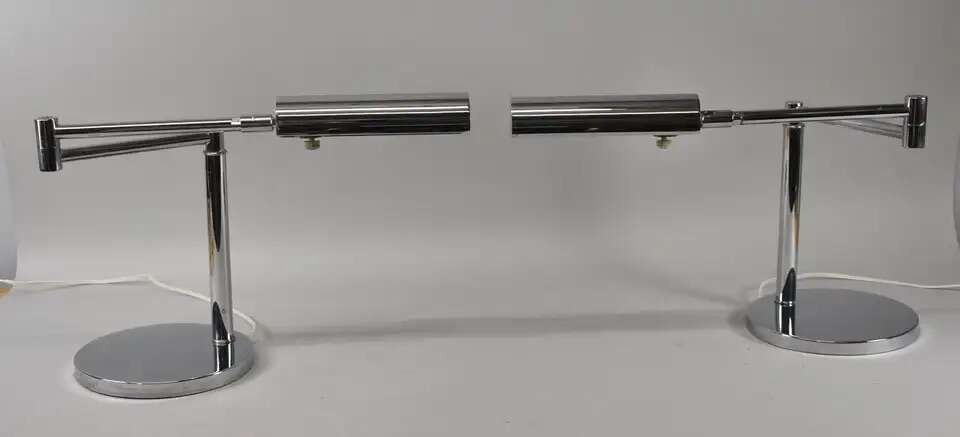 Beautiful pair of rare mid century modern chrome swing arm desk lamps made by Sölken-Leuchten for Koch & Lowy in perfect working order. Lamps have a variable dimmer dial to control the brightness and can be articulated and used in multiple configurations. Original wiring is in perfect condition.