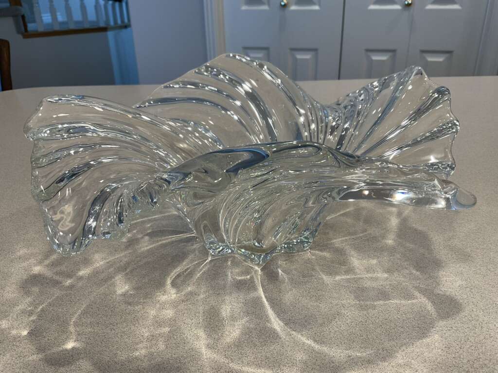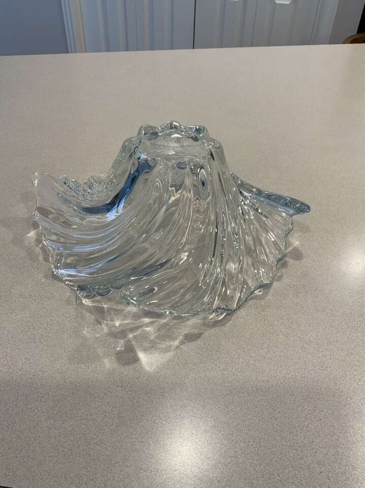 Beautiful crystal glass decorative bowl in a swirl pattern. It measures 12 1/2 wide x 4 1/2 tall