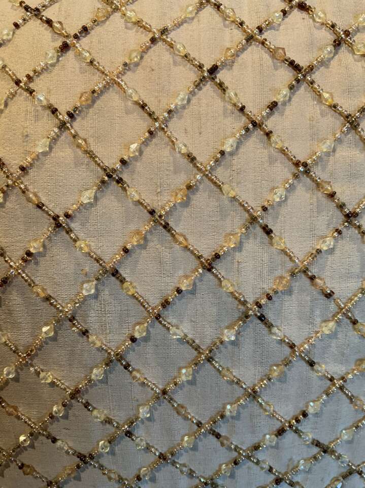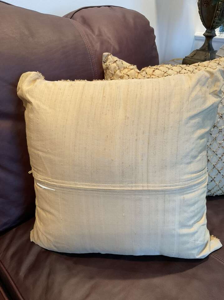 Beautiful set of 18x18 inch pillows. The gold fabric has a silky texture and with the gold beaded pattern it makes these very eye catching. They have a zipper in the back for access