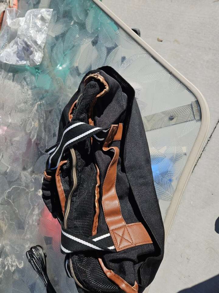 Small dog transportation bag with a hole for the head to come out of. with a leash attachment.... Used.. still fair condition.