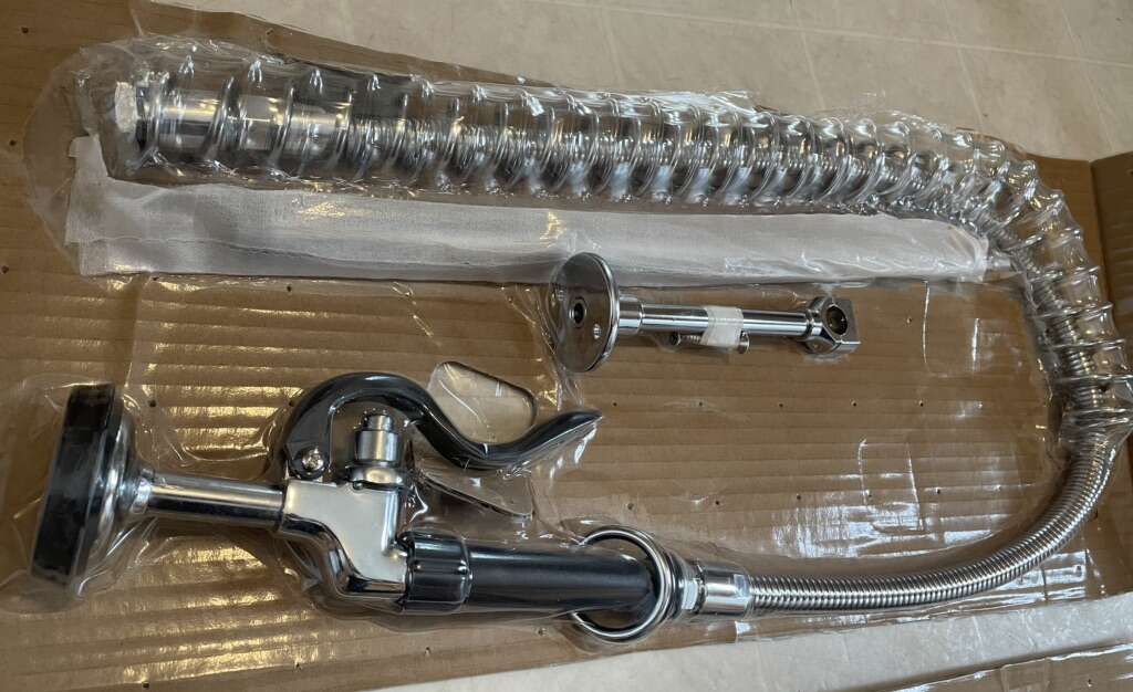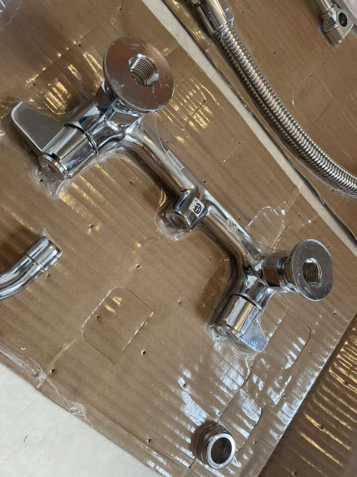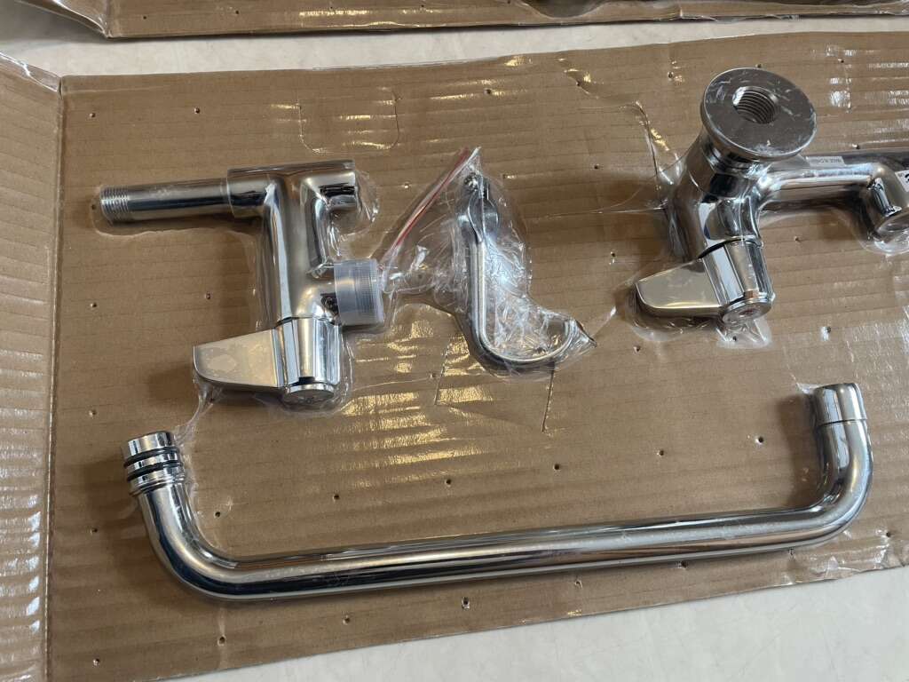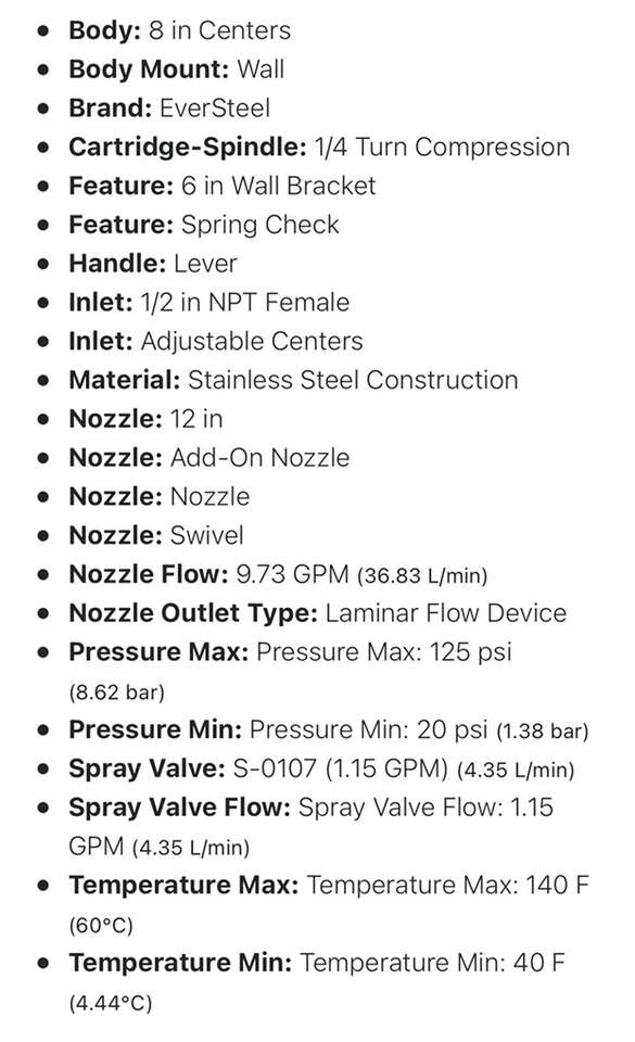 ZelleThis is a brand new EverSteel (TSBrass) 8 wall mount mixing faucet with stainless steel body, stainless steel add-on faucet, stainless steel 12 swing nozzle with stream regulator outlet, stainless steel 18 riser, 44 flexible stainless steel hose with heat resistant handle, stainless steel 1.15 GPM blue spray valve, stainless steel compression cartridges with spring checks, stainless steel lever handles, stainless steel 1/2 NPT female inlets,stainless steel 6 adjustable wall bracket, stainless steel spray valve holder and stainless steel overhead spring. Certified to ASME A112.18.1/CSA B125.1,NSF 61-Section 9 & NSF 372. 2019 DOE PRSV - Class II compliant. (Specs are in the pictures) Model S-0133-A12-B