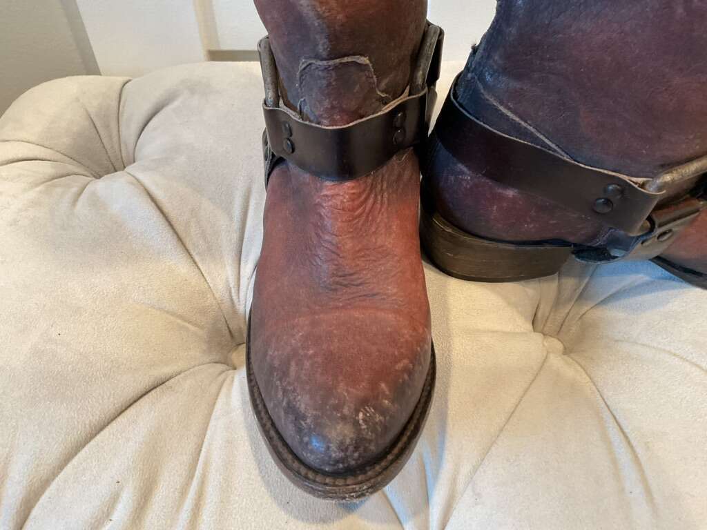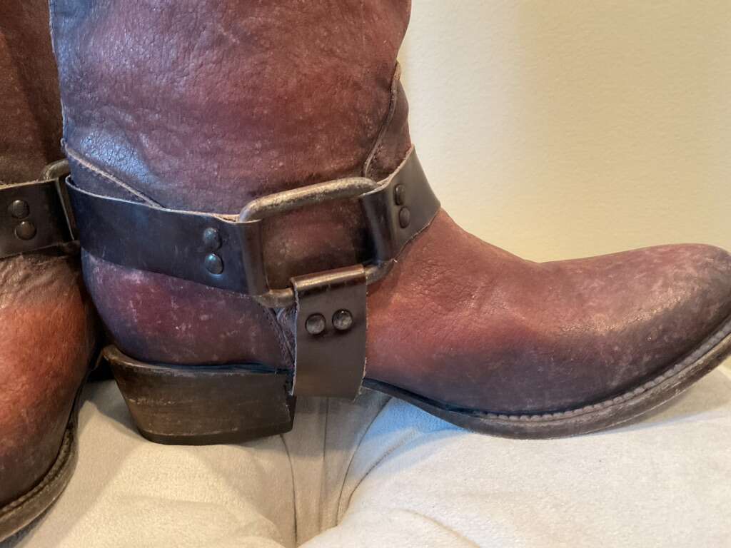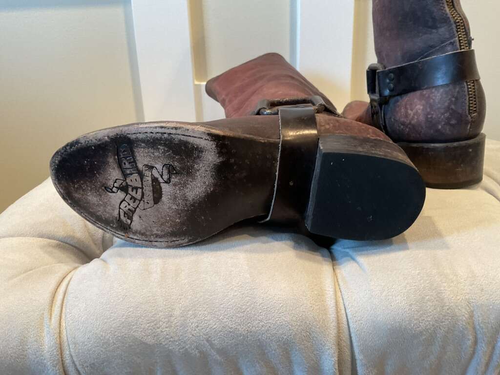 Beautiful Burgandy color on this Freebird leather boot. Zips in back for access and has a 2 inch heel. The size is a 9 and in great condition. Minimal wear. Nice design with straps and ring.