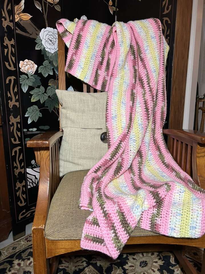 Like-New Charming TWIN size hand crafted crocheted throw blanket features a bright and cheerful pattern of multicolors combined creatively: stripes in bright pink surround a stripe of variegated yarn from pale pink to maroon to shades of brown; followed by yarn featuring variegated pastel colors surrounding yellow stripes. Definitely a one-of-a-kind and sure to brighten any Barbie or “Legally Blonde” enthusiast’s room, be it at home or college dorm. Size: 82 in X 50 in, measurements taken in the middle and not at the stretchy corners for a more accurate value. This maximalist fun style blanket is perfect for any room in your home and adds a Barbiecore, bright pastel-goth, farmhouse, or boho vibe to your decor. It's suitable for teens, adults, and kids. Like new condition and has no rips, tears, snags, stains and is smoke free.